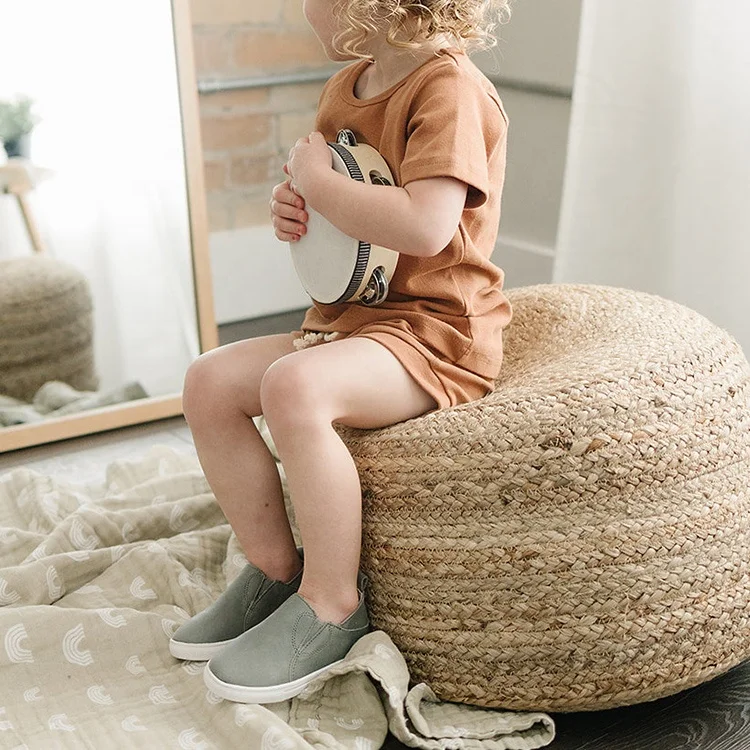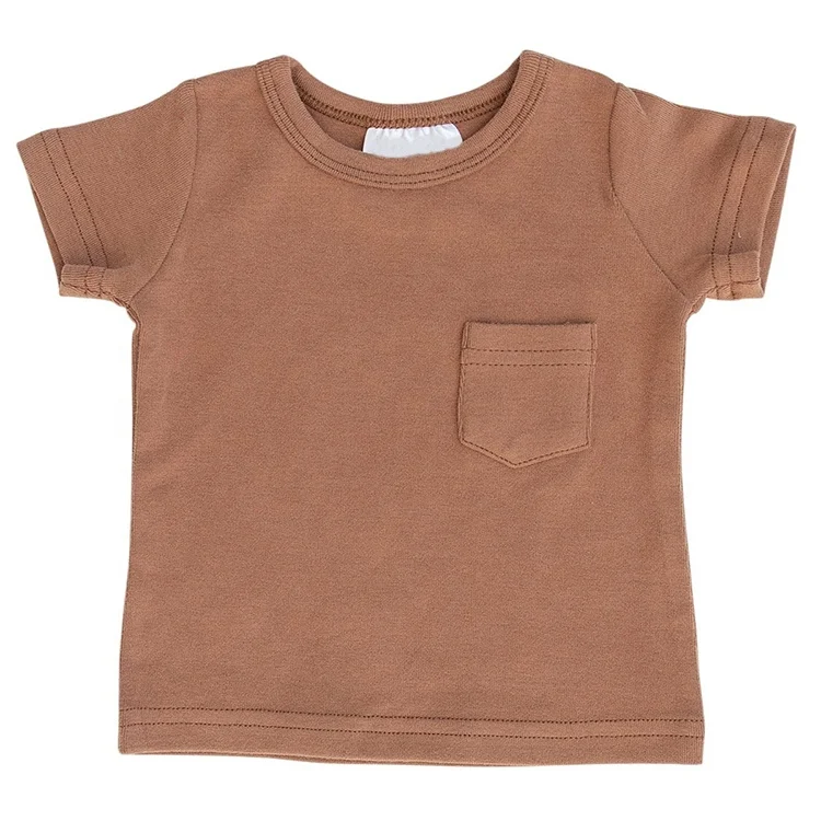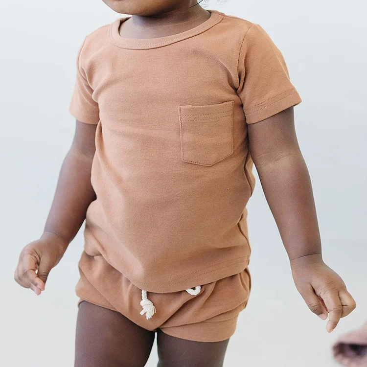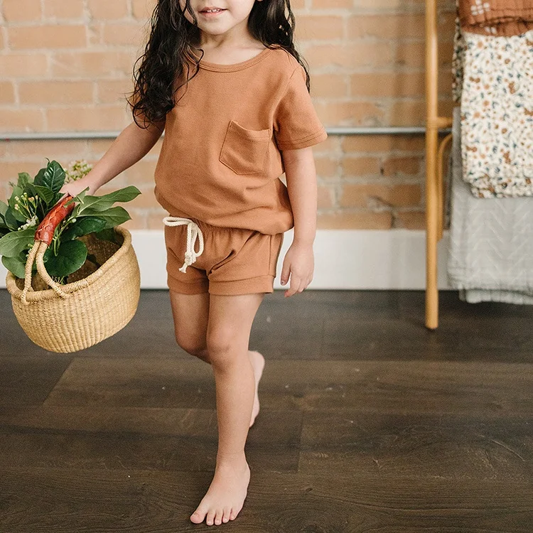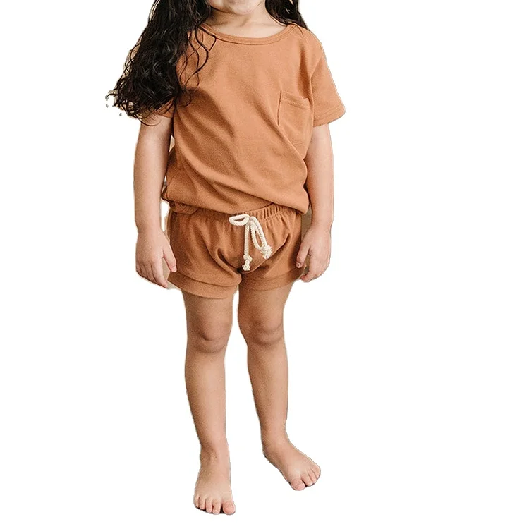 Product Name: Plain Pocket Short Length 2 Piece Set for Girls Brown Short Sleeve Summer Casual Girls Clothing Sets