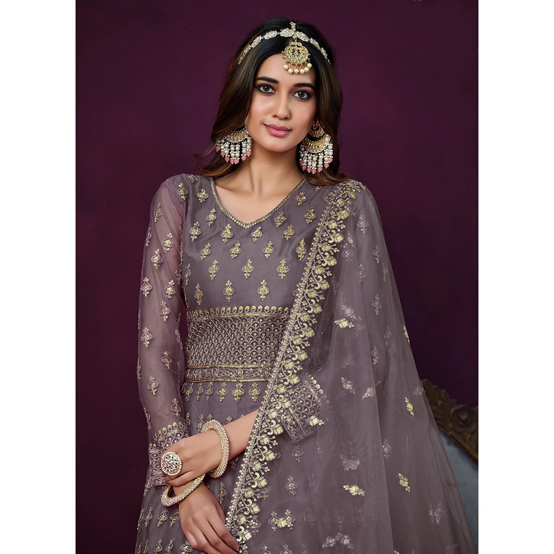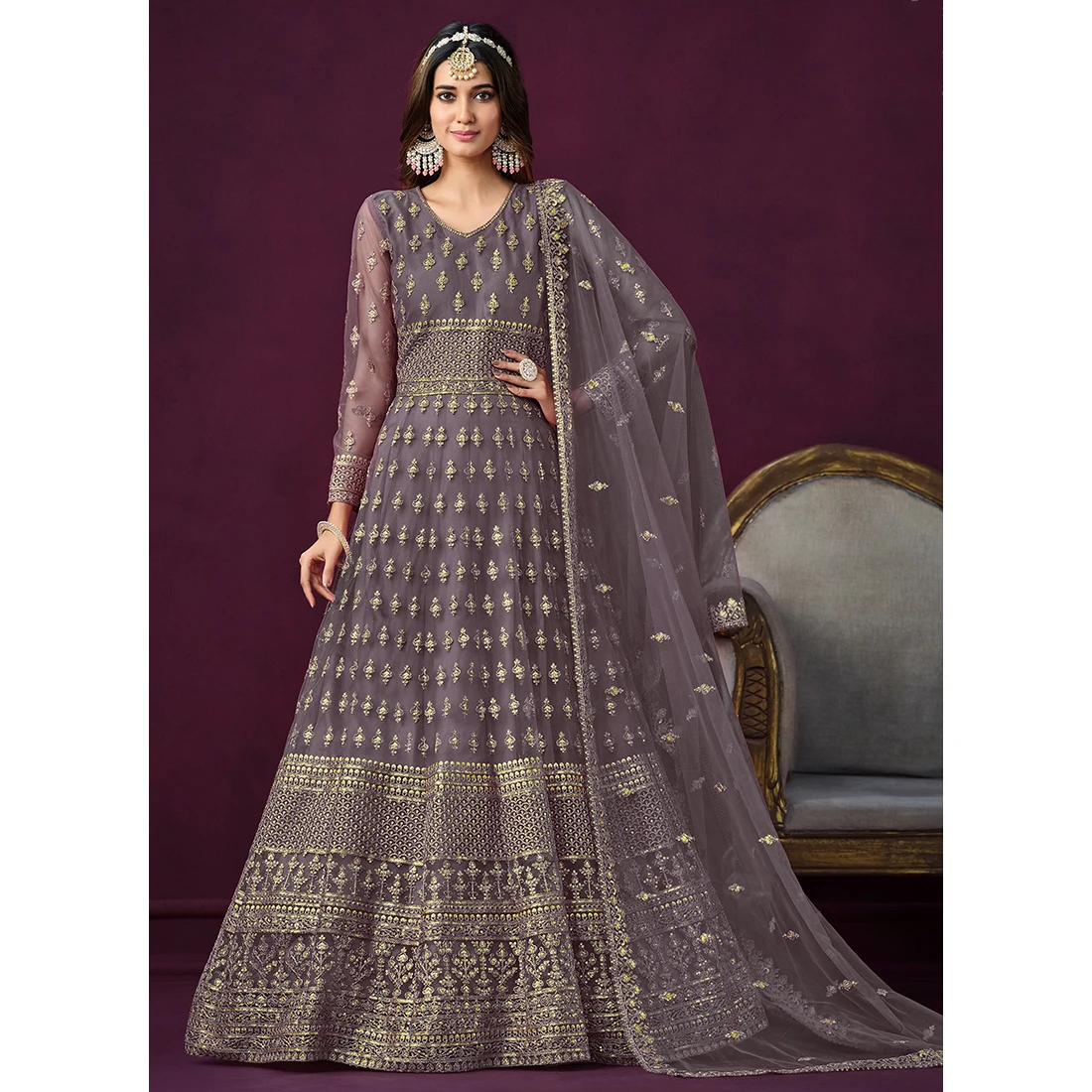 Purple Embroidery Work Net Evening Dress with Dupatta Elegant and Alluring