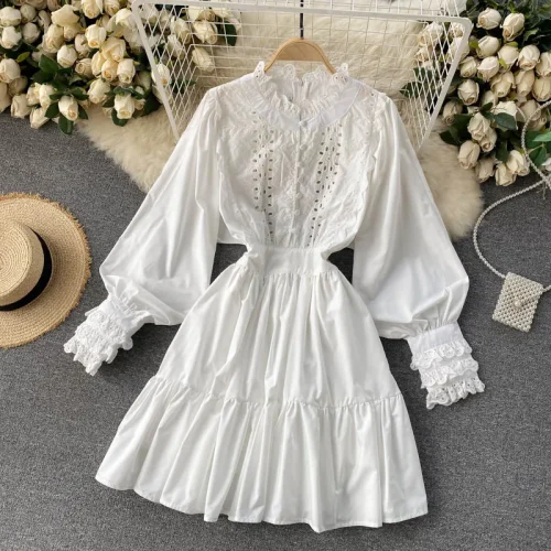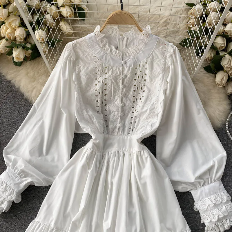 Q109013 Hepburn Short Lace Flower Lantern Sleeves Waist Slim Single-breasted Large-swing Ruffled Hollow Out Maxi Dress