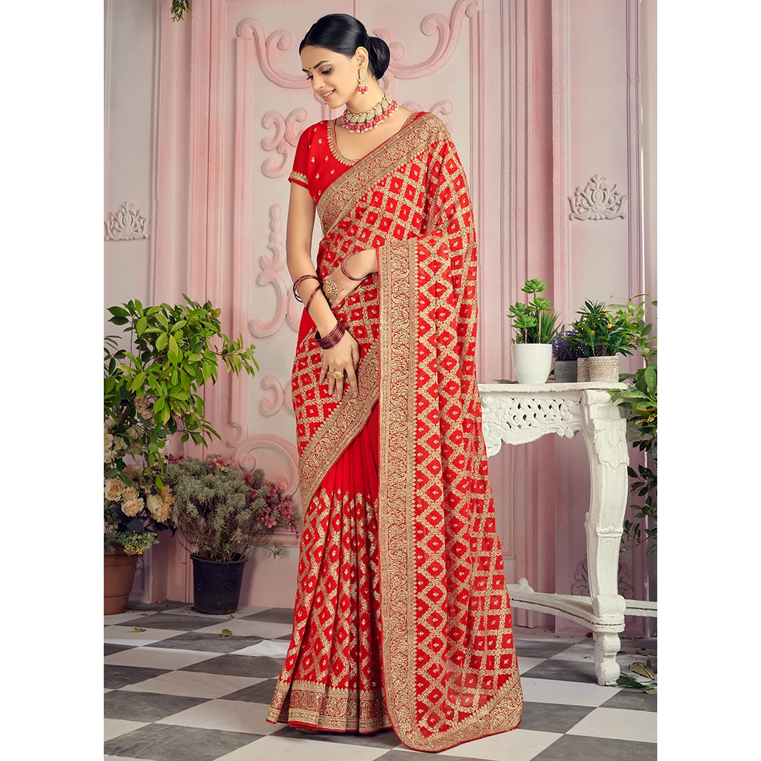 Red Georgette Designer Saree with Resham Work Elegant Evening Dresses