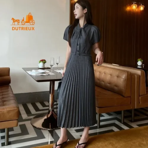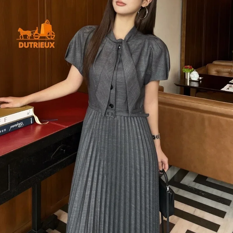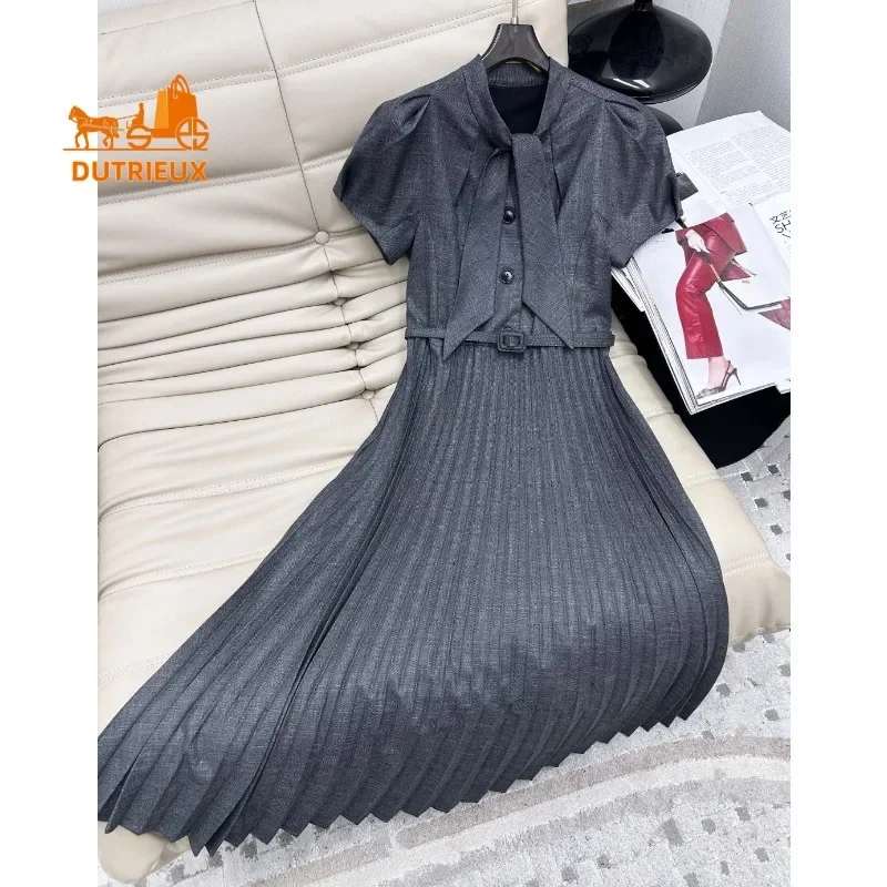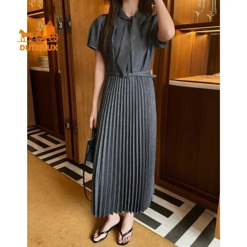 Retro Summer Bow Women’s Short-sleeved Dress, Luxurious and Elegant Tie Hem Pleated Skirt, Daily Travel Holiday Beach Dress 315