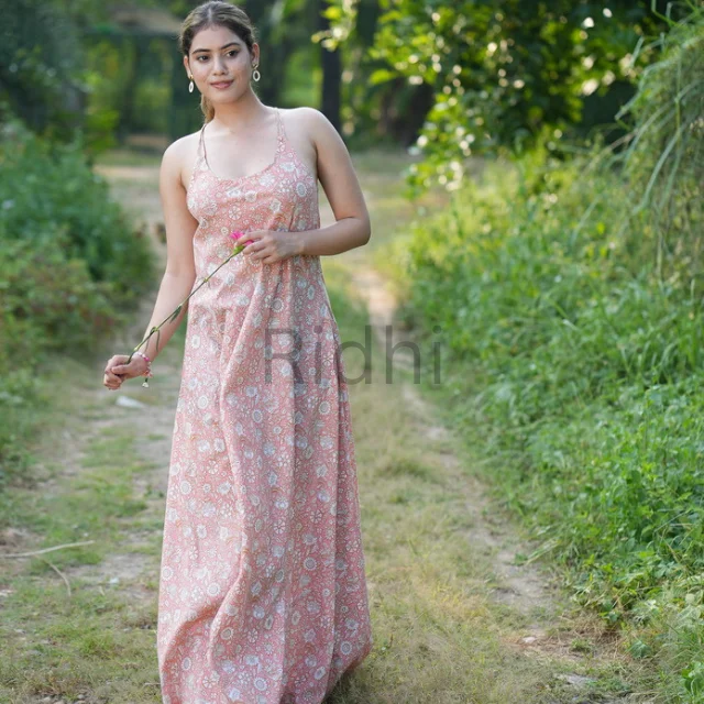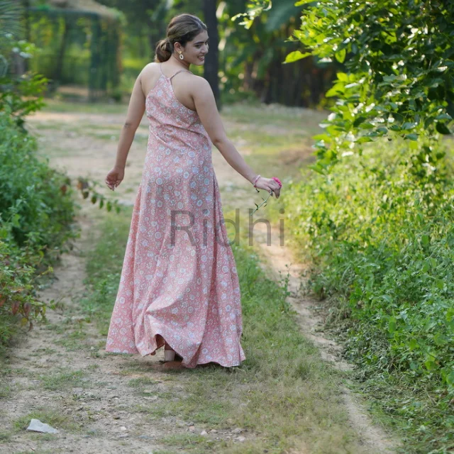 Product Name: Salmon Pink and white Hand Block Printed Cotton Maxi Dress Boho Summer Outfit for Women, Resort & Beachwear 2025