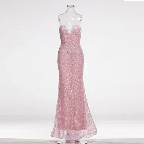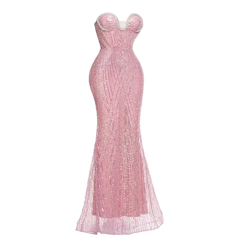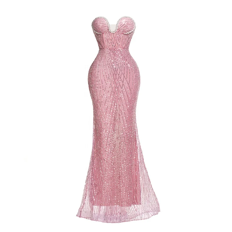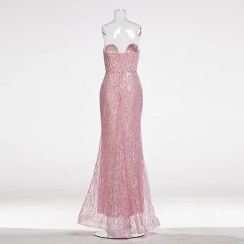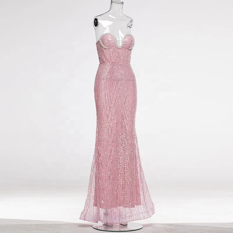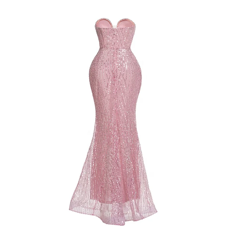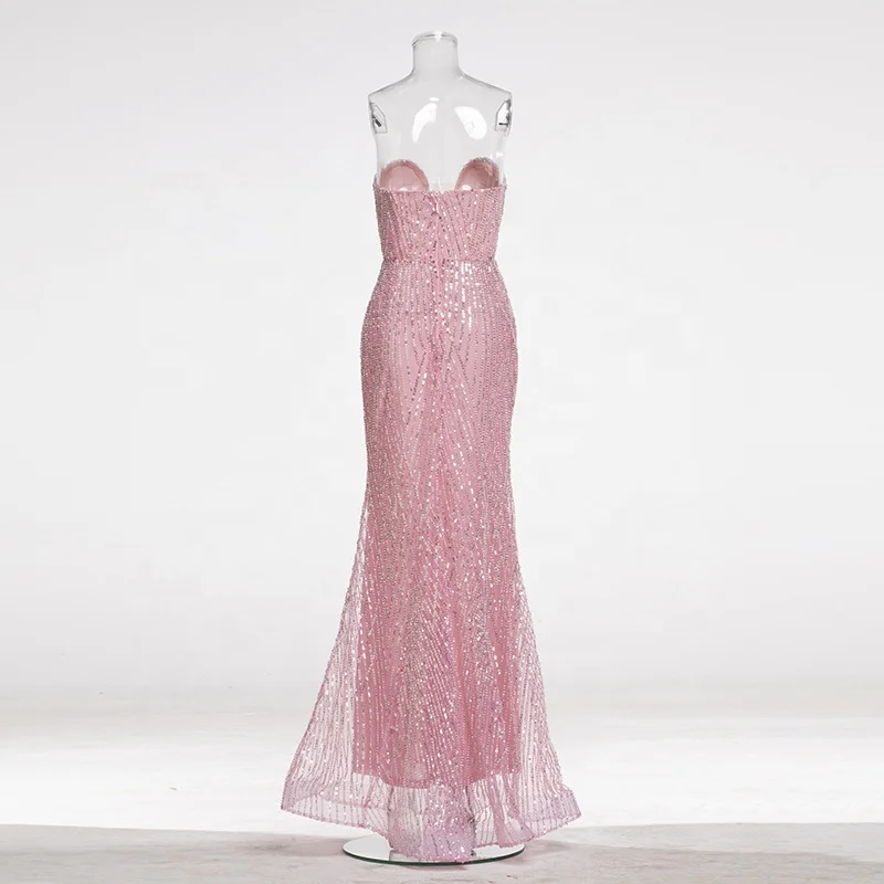 Sequins Mesh Strapless Backless Sleeveless Mermaid Floor Length Dress Club Party Prom Reception Cocktail Trendy Evening Gown