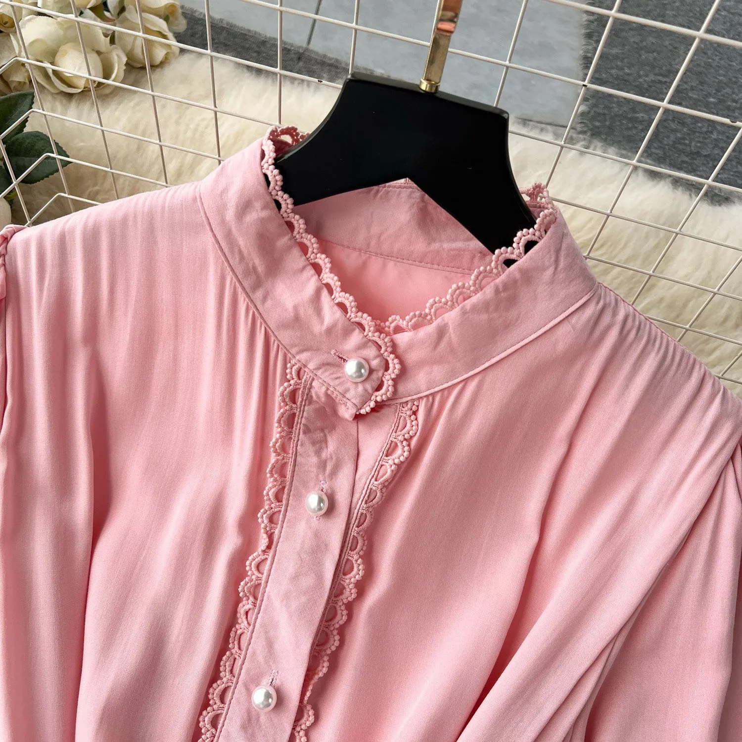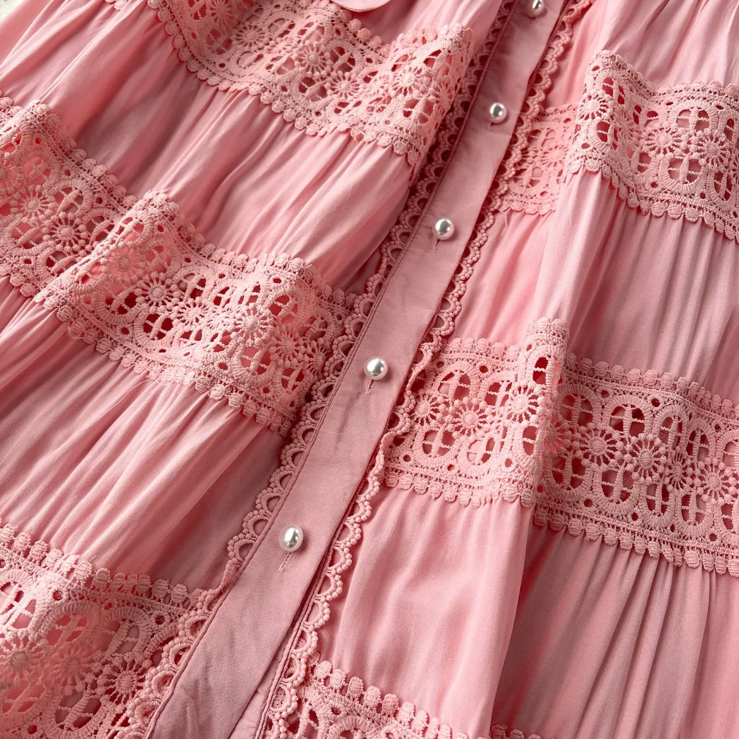 Spring Temperament and Elegant O-neck Lace Hollow Edge Splicing Layered Long Dress Beautiful Bubble Sleeve Midi Dress