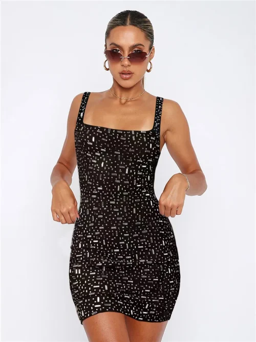 Product Name: Square Neck Rhinestone Dress Boutique Stylish Sleeveless Plain Sequins Bodycon Sexy Slip Midi Dress for Women
