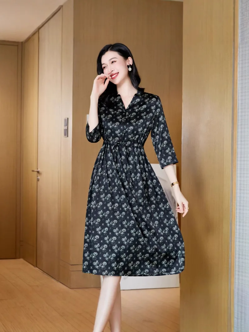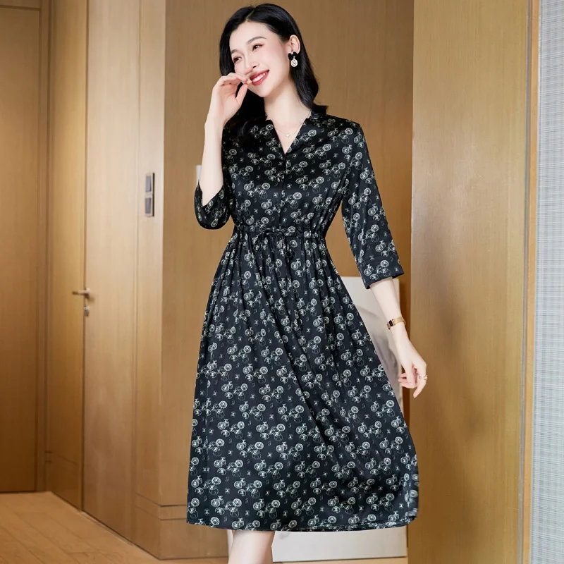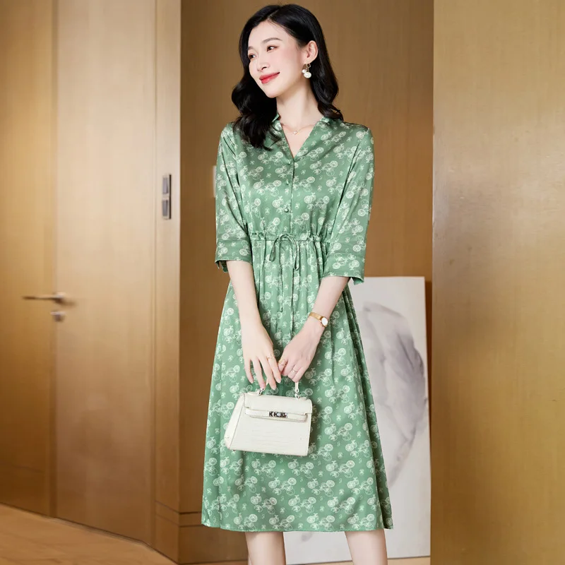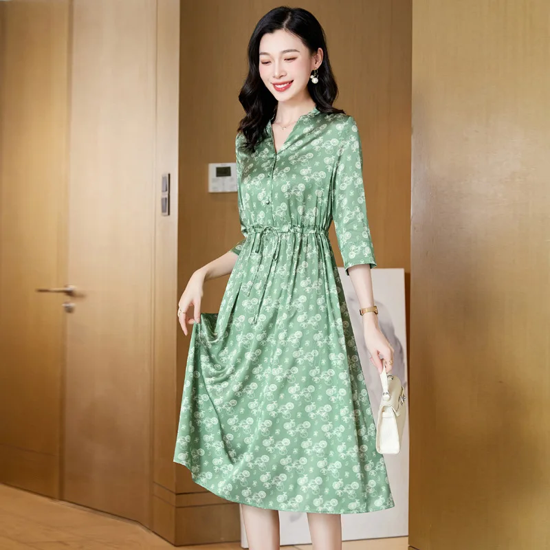 Summer Elegant and Versatile V-neck Silk Dress with Floral Prints and a Slimming Waist, a Long Silk Dress in a Casual Style