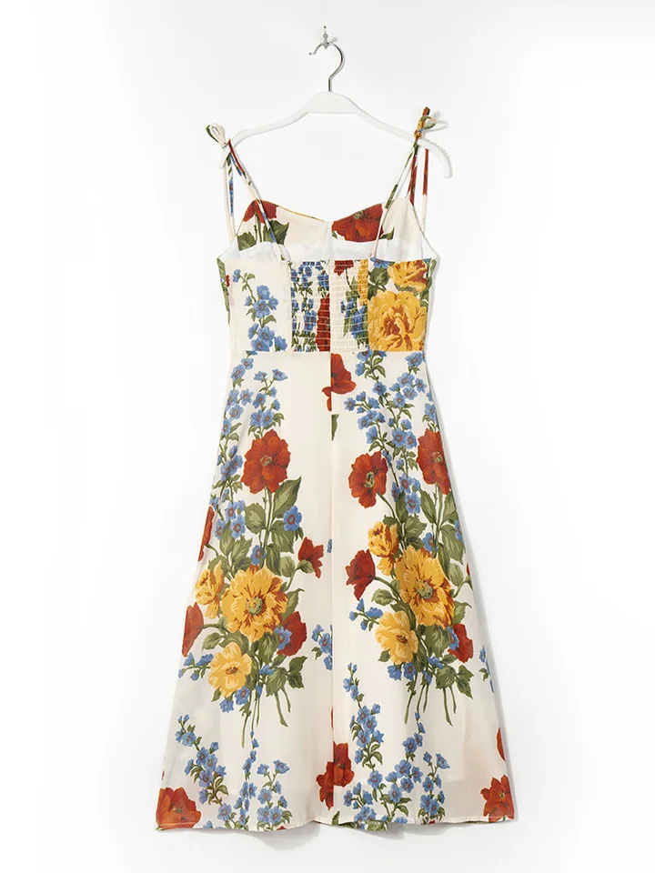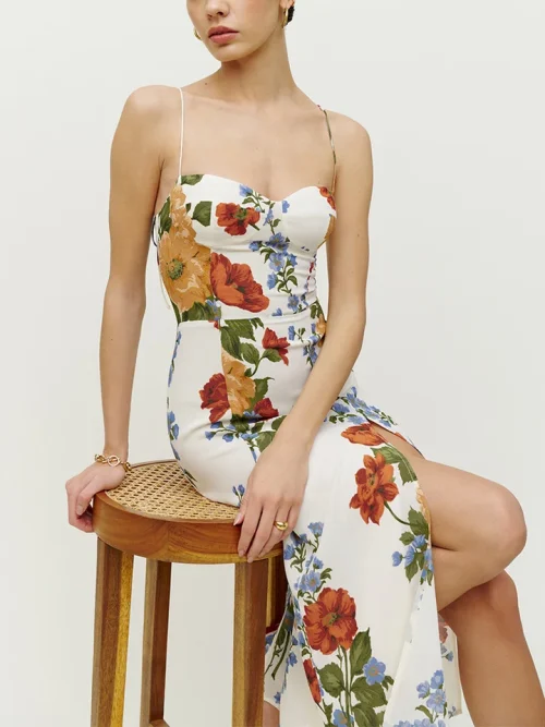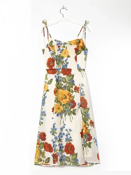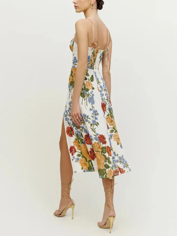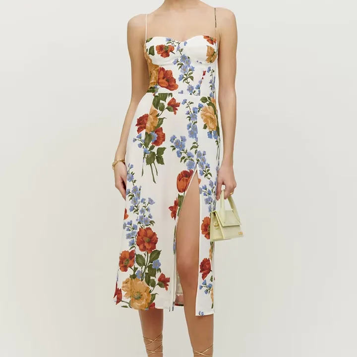 Product Name: Summer Elegant Strapless Neckline Midi Dress for Women Vintage Floral Print Chiffon Sexy Slit Spaghetti Sundress Casual Dresses