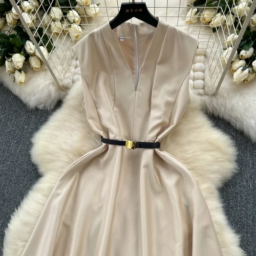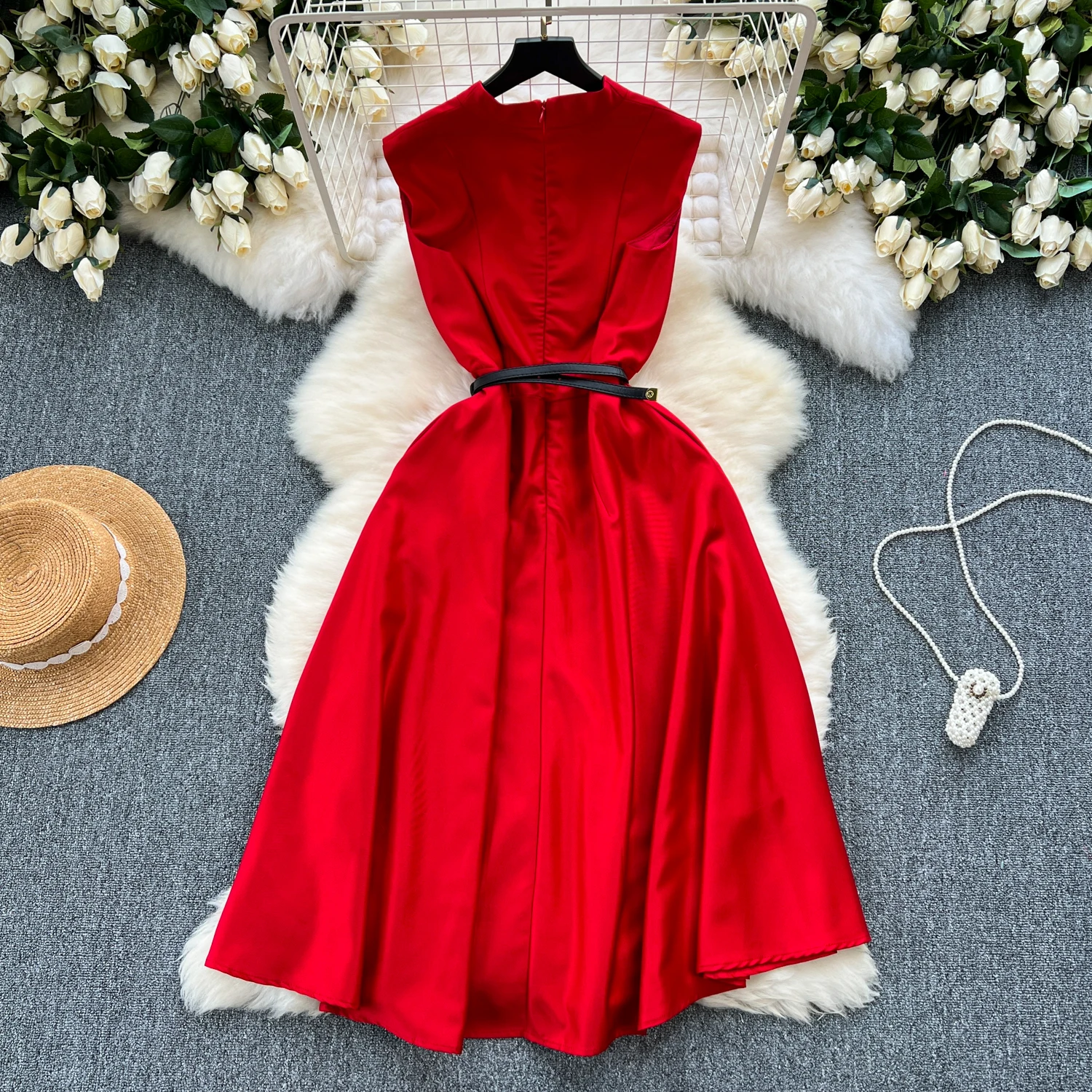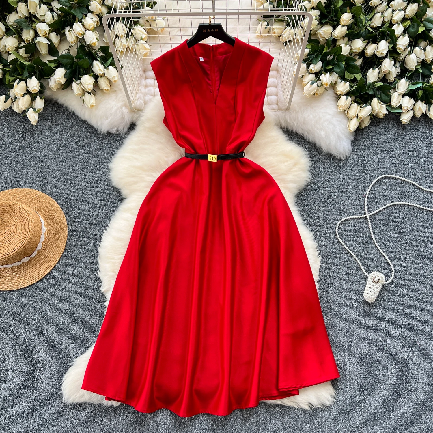 Product Name: Summer Elegant V-Neck Sun Midi Dress for Women Sleeveless Empire Lace Vestidos Red