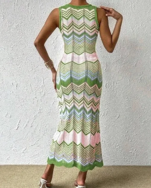 Summer Knitted Beach Dresses Splicing Stripe Sleeveless Summer Women Knitted Dress Holiday Sundress Hollow Out Long Dresses
