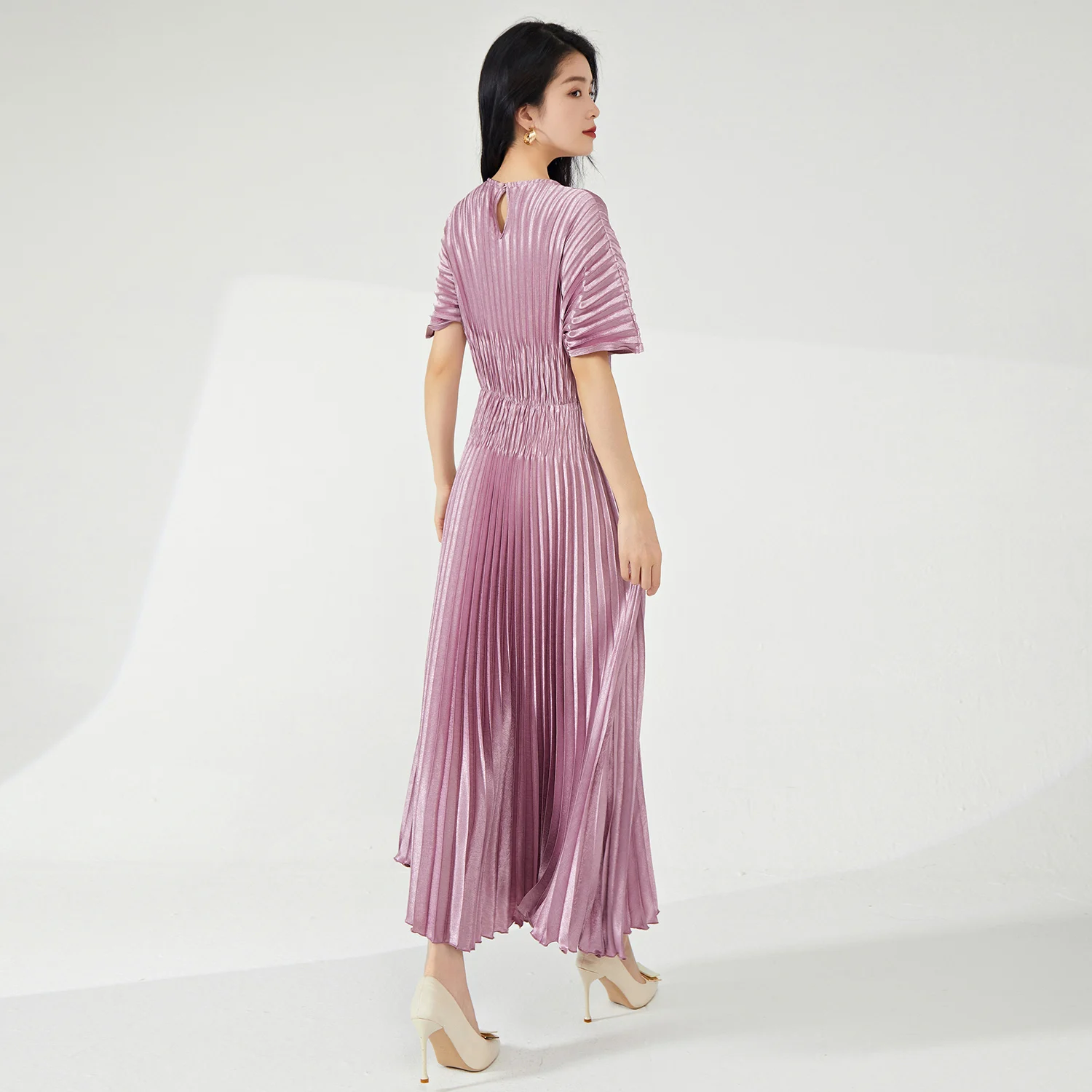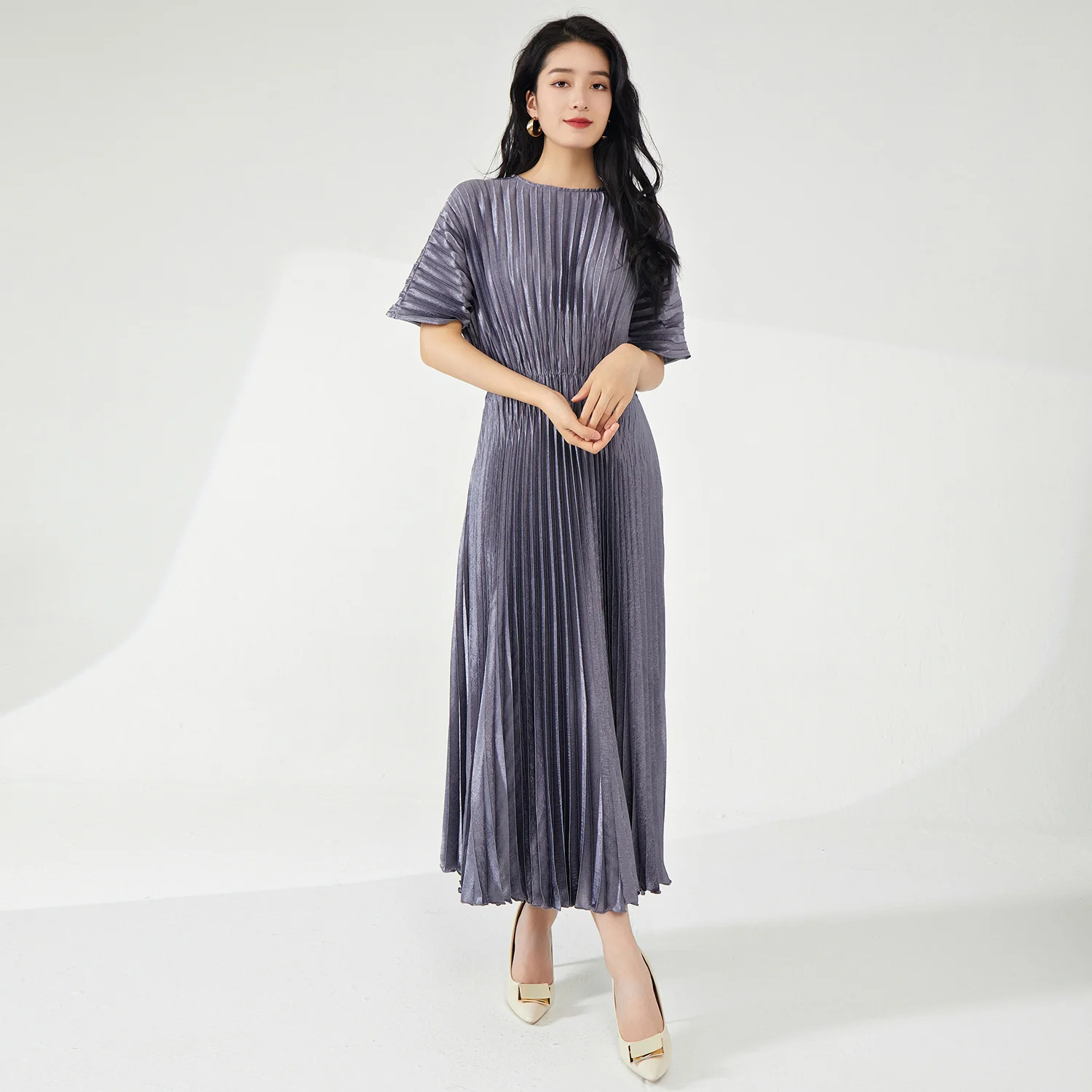 Product Name: Summer New Women’s Mid-Length Dress Fashionable Elastic Pleated Design with Short Sleeves Casual Woven Fabric Dress
