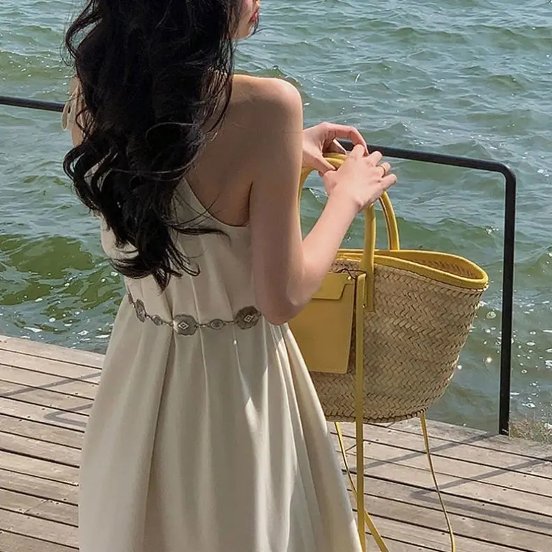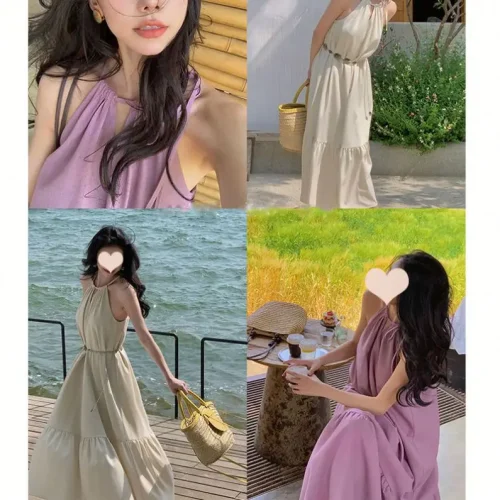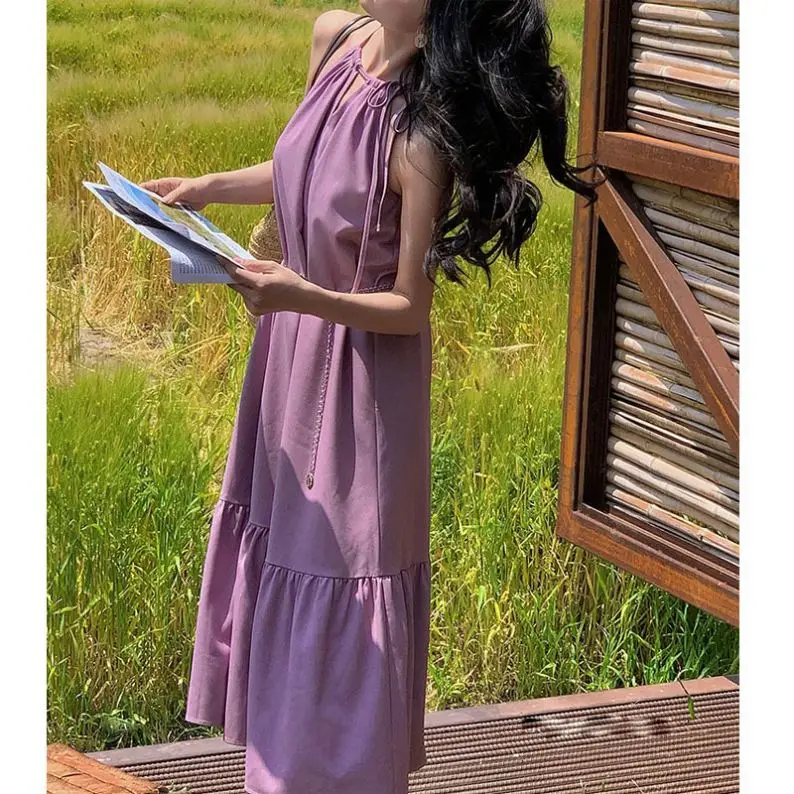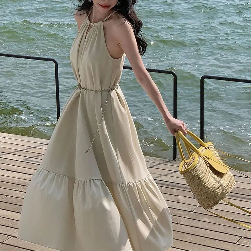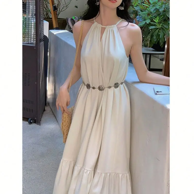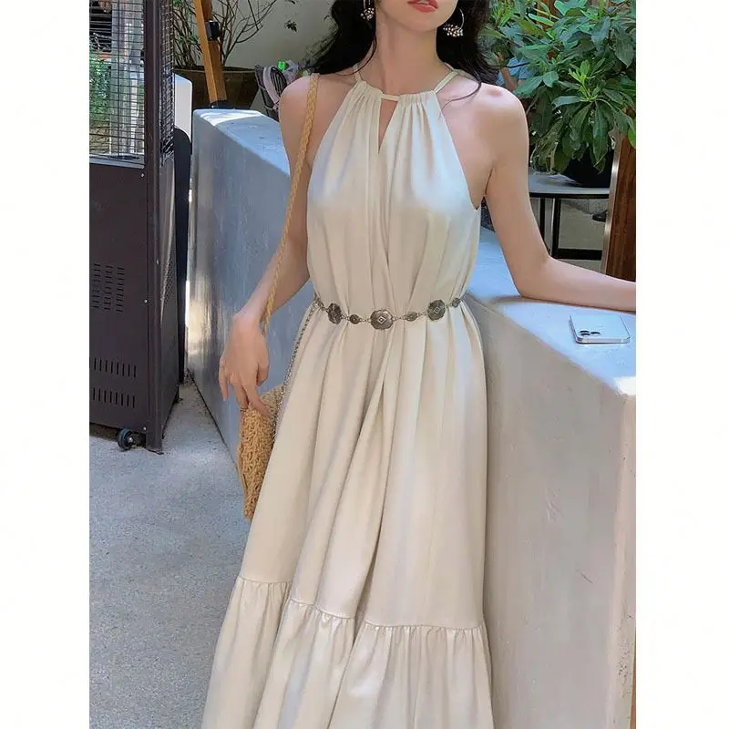 Product Name: Summer Solid Color Hanging Neck Sleeveless Pleated Back Women Long Dress
