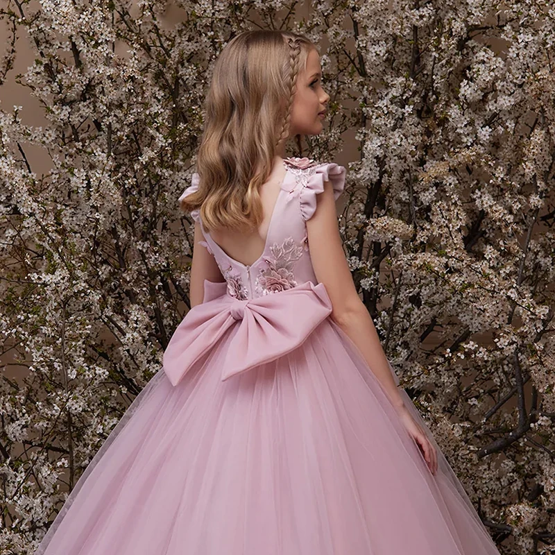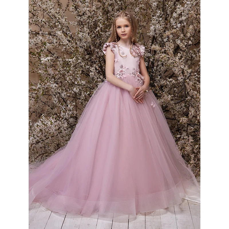 Product Name: Sweet Formal Style Luxury Long Tulle Ball Gown Dress Kids Girls Cap Sleeves Appliqued Petal Flower Girls O-Neck Summer Dress