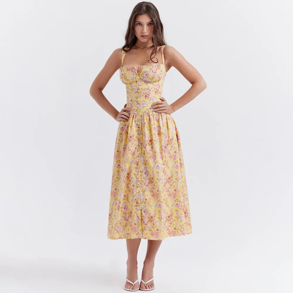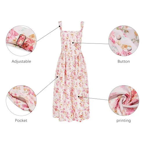 Product Name: Sweet Summer Floral Print Casual Dresses Slim Waist Lace up Pockets Hidden Zippers Midi a Line Vacation Sundress