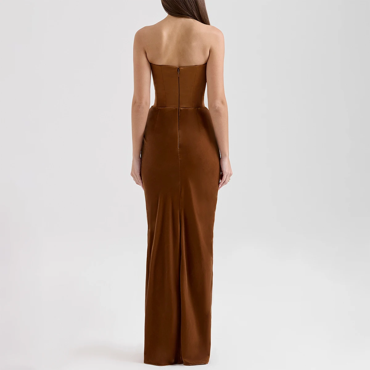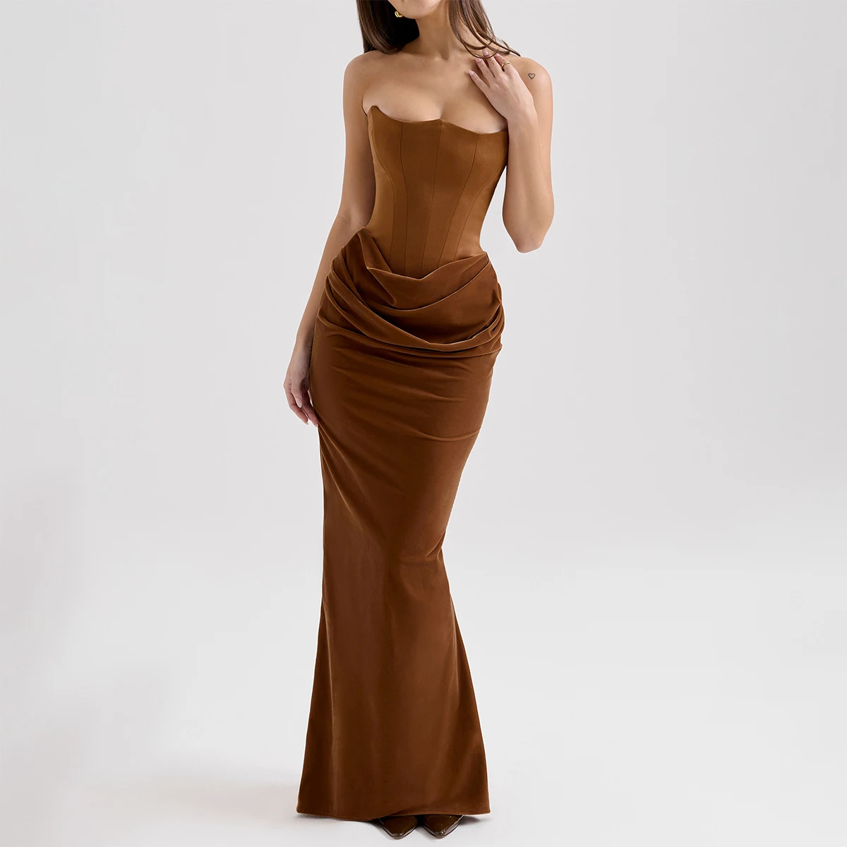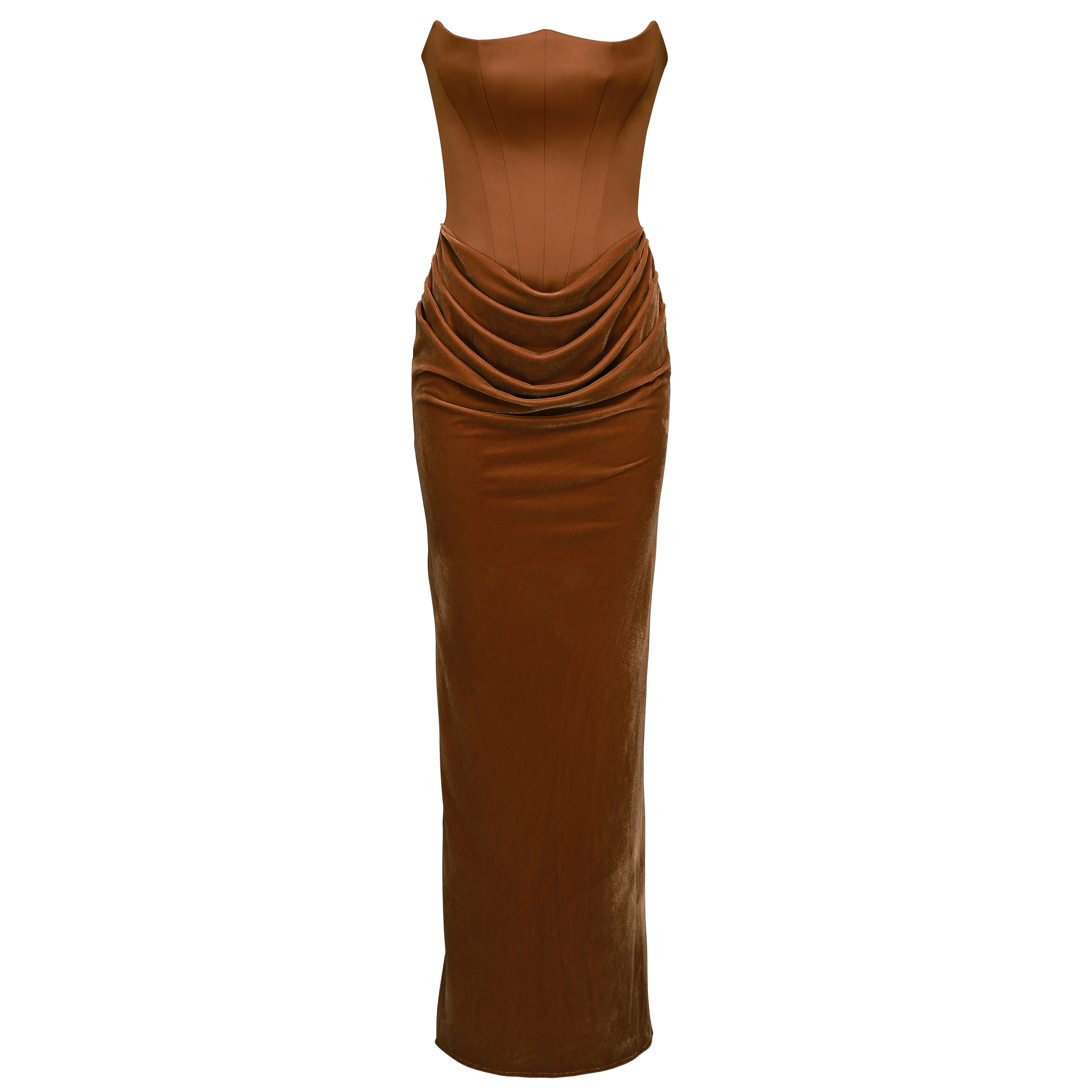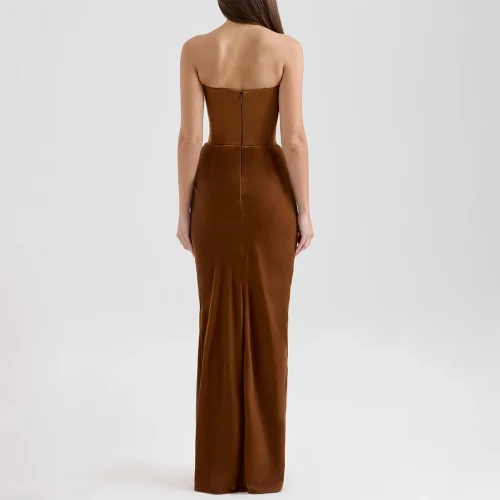 Product Name: Toffee Velvet Strapless Corset Maxi Dress for Women Elegant Evening Gown Formal Party Dress