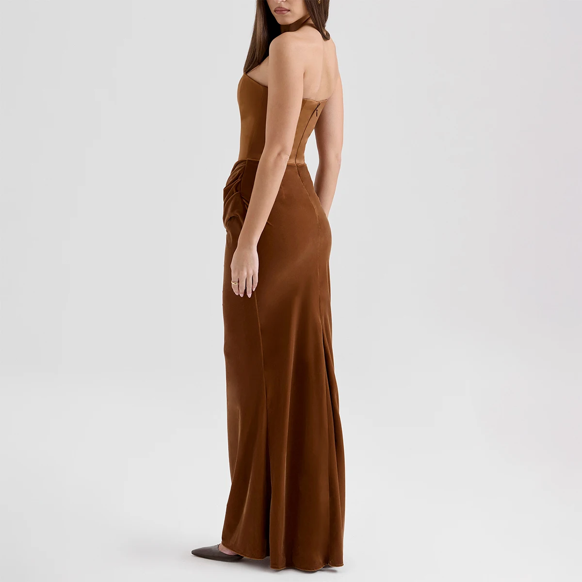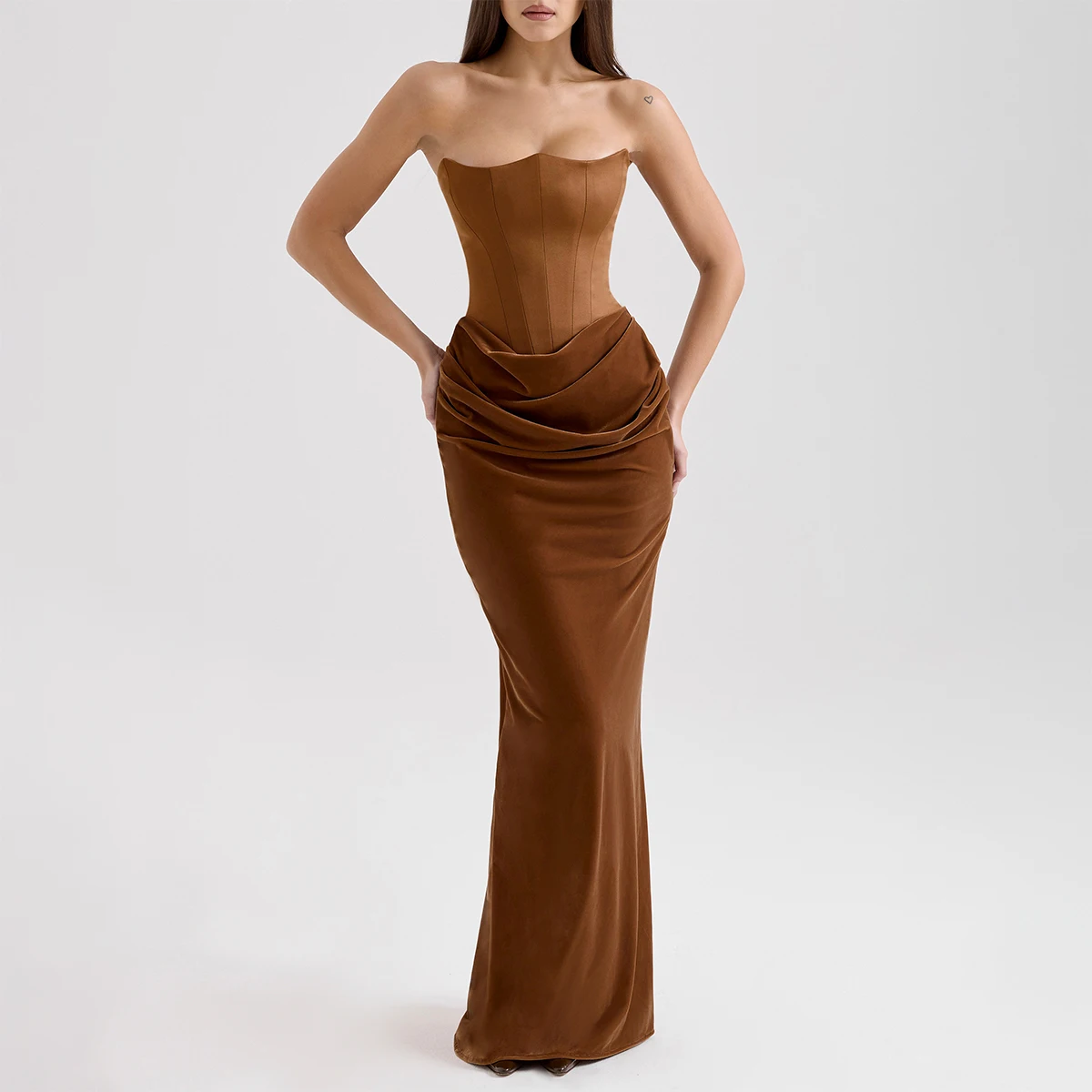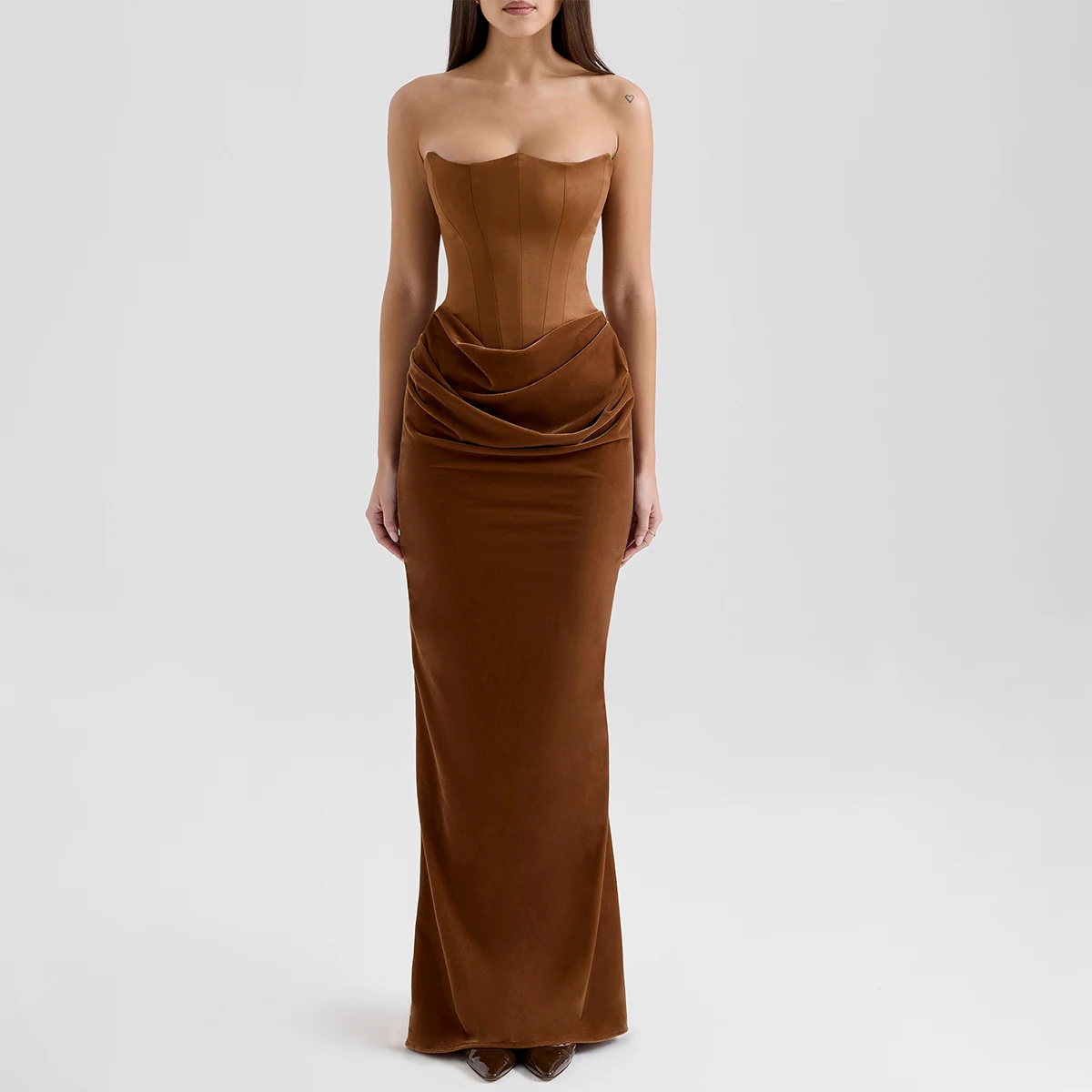Product Name: Toffee Velvet Strapless Corset Maxi Dress for Women Elegant Evening Gown Formal Party Dress