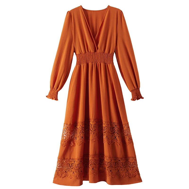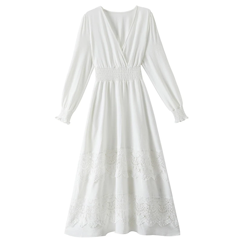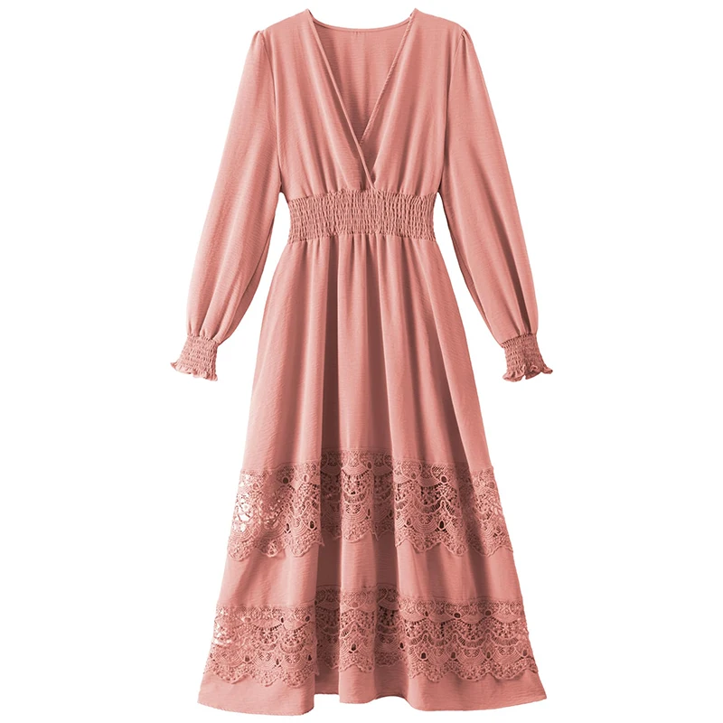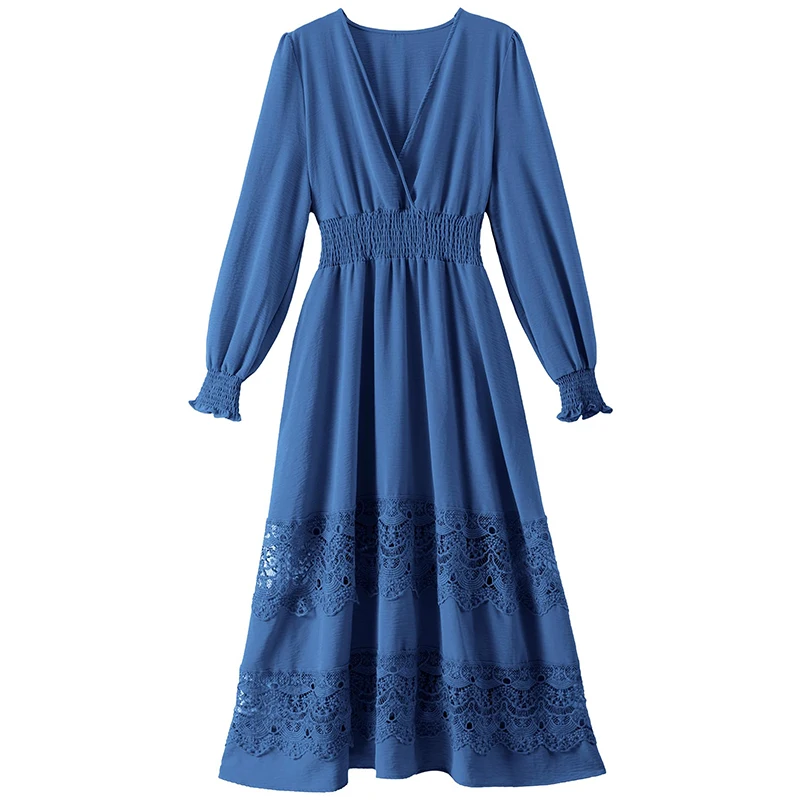 Product Name: USA Ready Stock Casual V Neck Smocked Waist Lace Boho Dress Women Long Sleeve Bohemian Maxi Dresses for Birthday Wedding Party