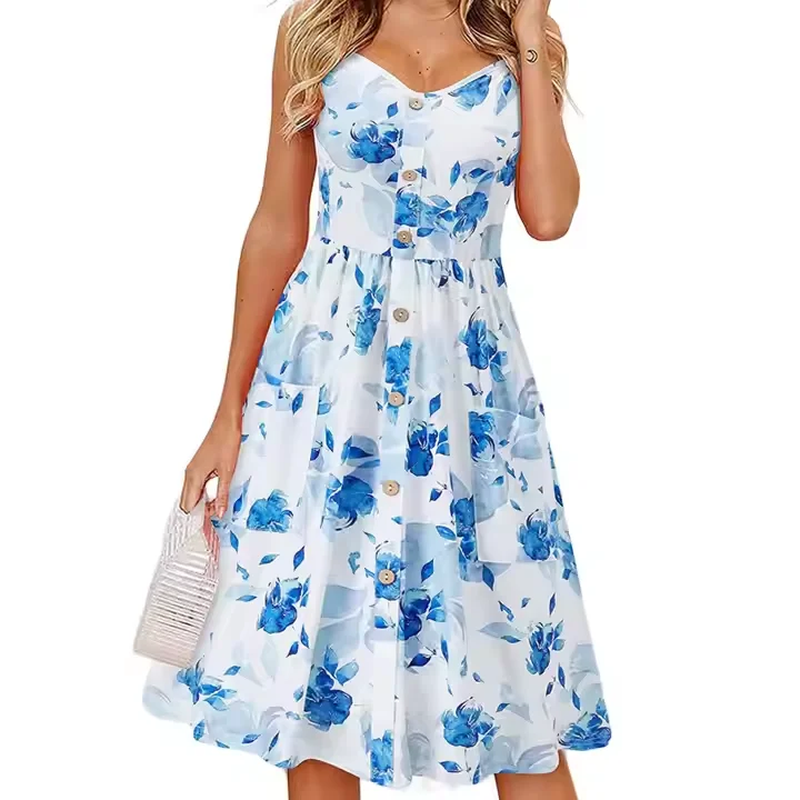 Product Name: V2154-VVV-Casual Beach Sundress Floral V Neck Button Front Floral Dress With Pockets