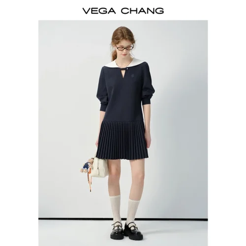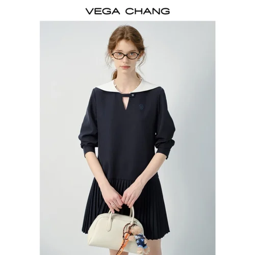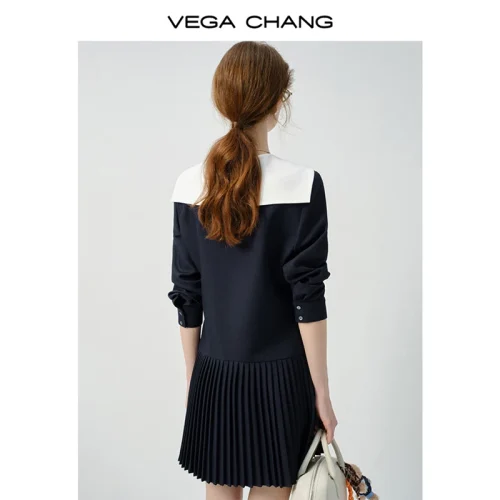 Product Name: VEGA CHANG Spring 2025 A-Line Dress Featuring Contrasting Color Sailor Collar Pleated School Style Dress for Women