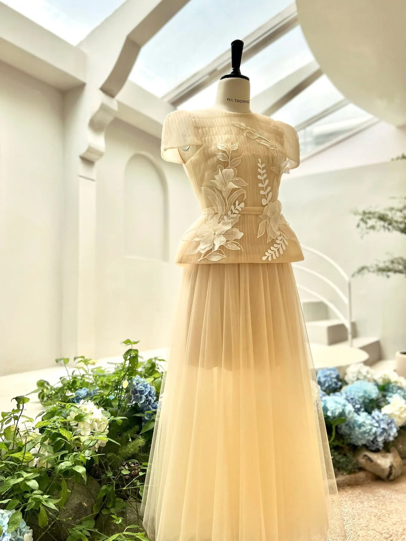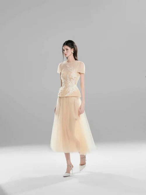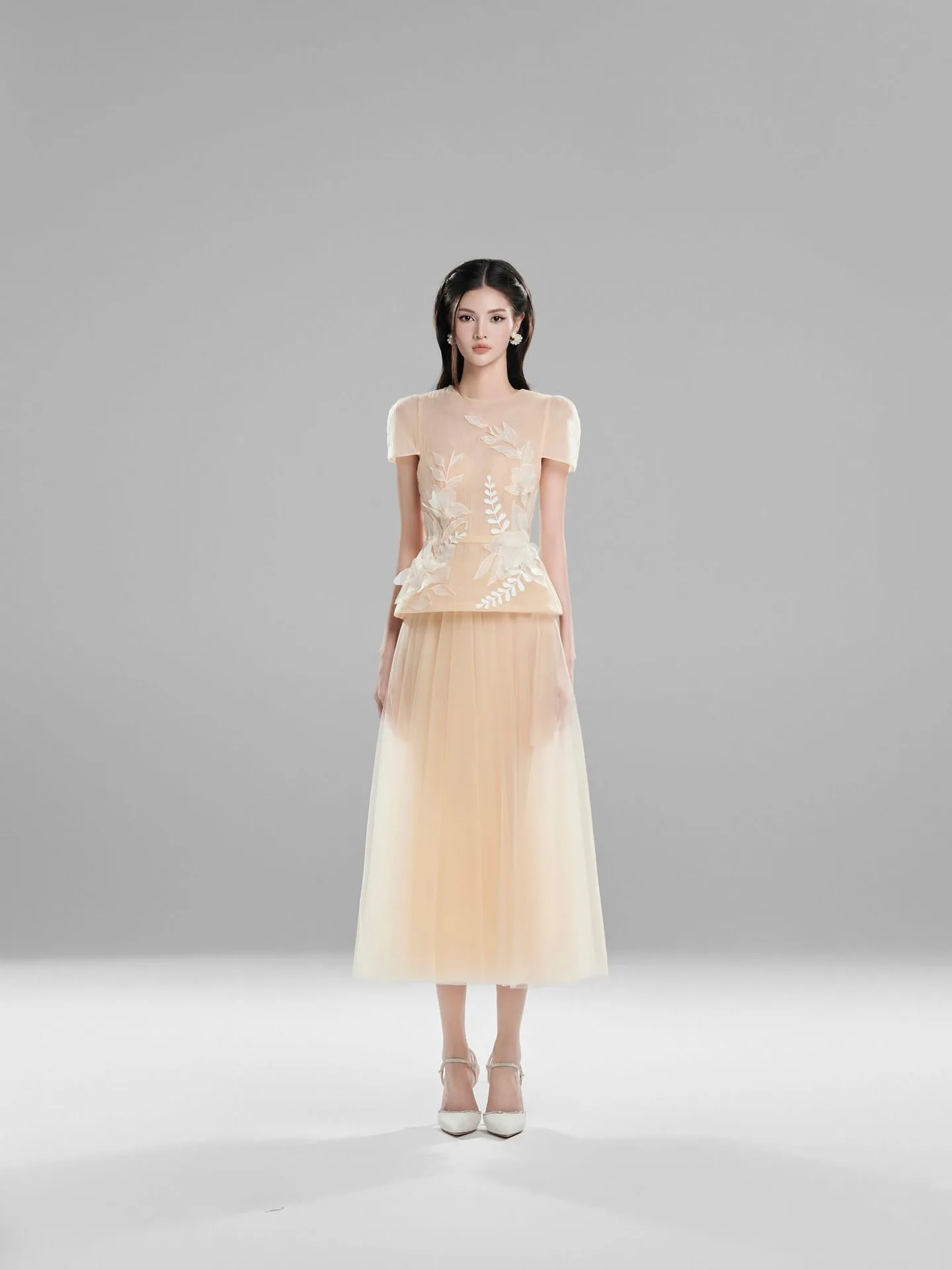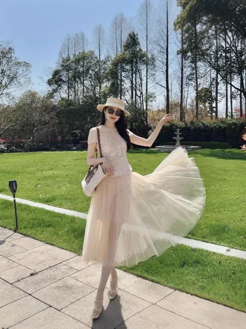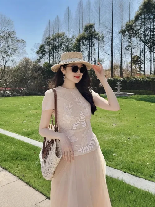 Product Name: Vietnam 2025 Niche Brand High Waist Mesh Pleated Long Skirt Floral Embroidery Elegant Party Dresses Ladies Two-Piece Set