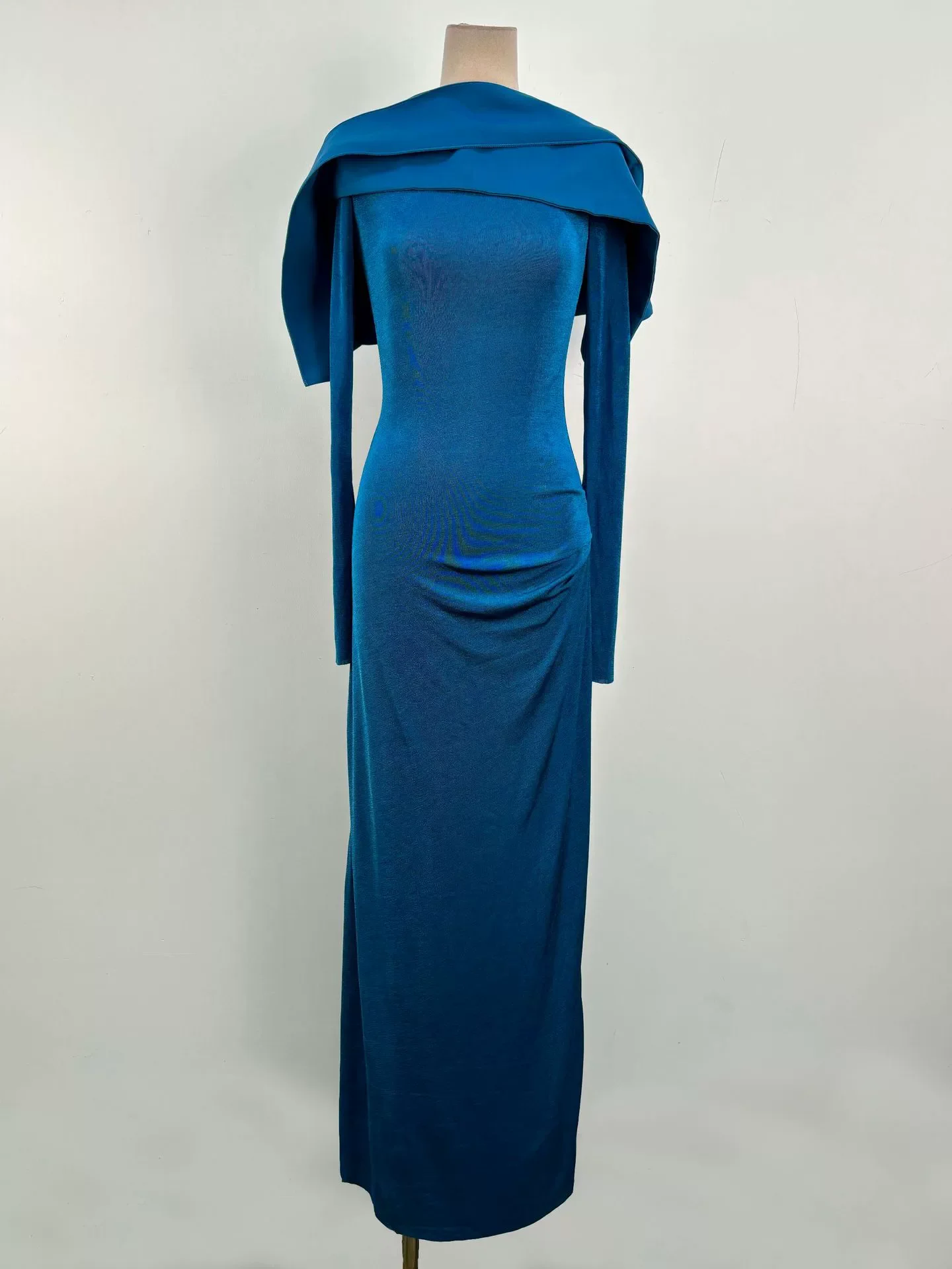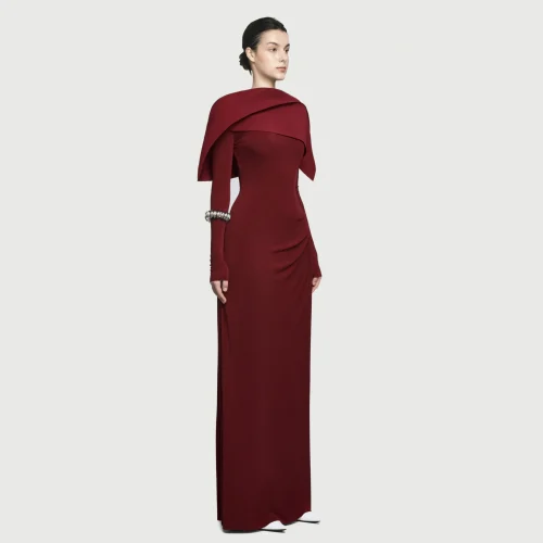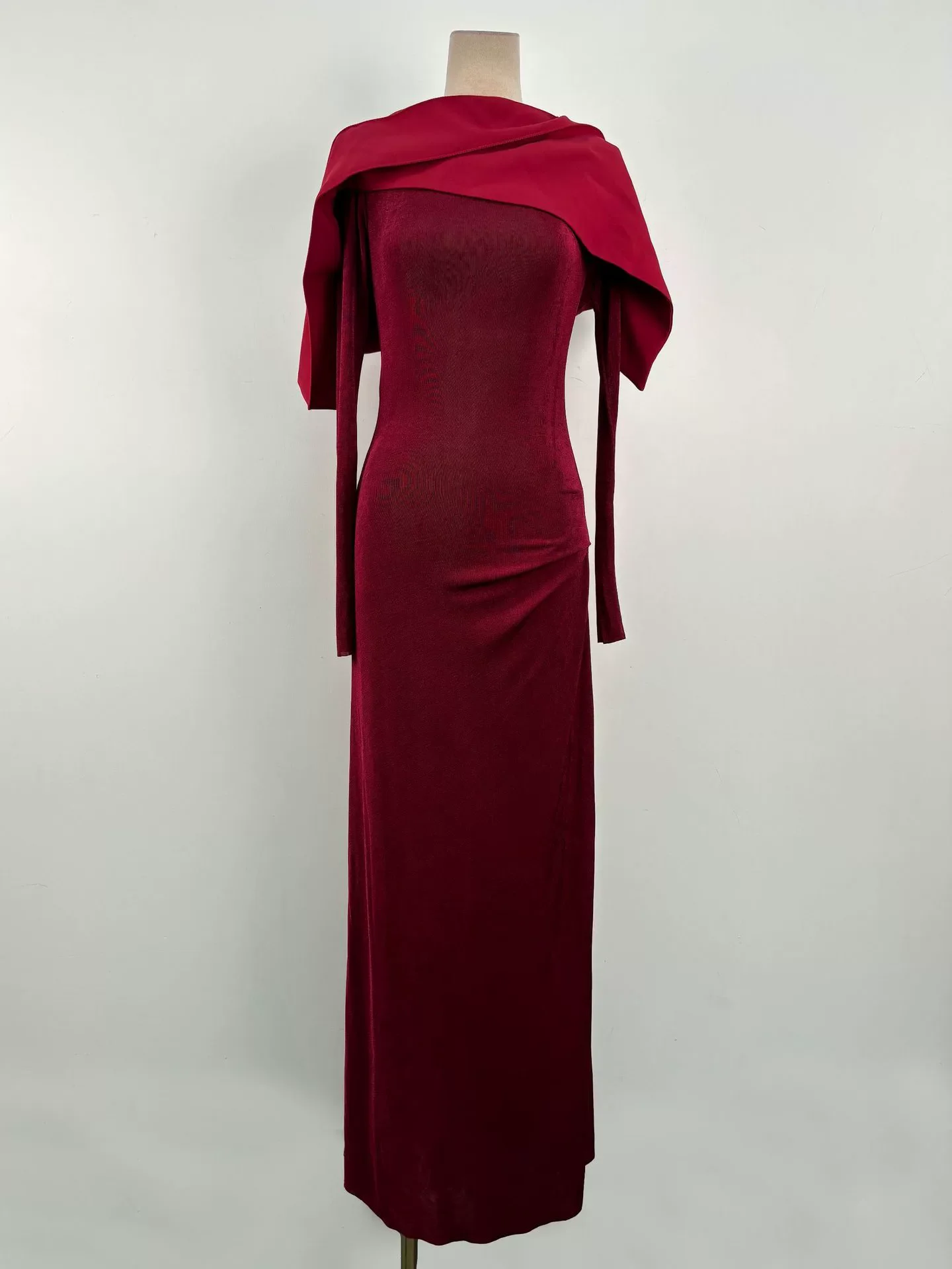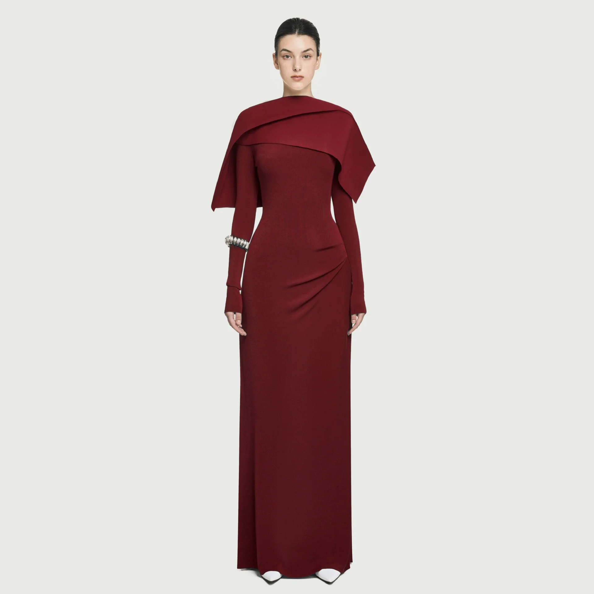 Product Name: Vietnam 2025 Ramadan Collection Elegant Red Long Women Dress Casual Party Pleated Neck Slim Plain Evening Dress Fit Breathable