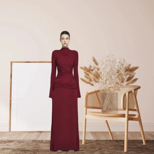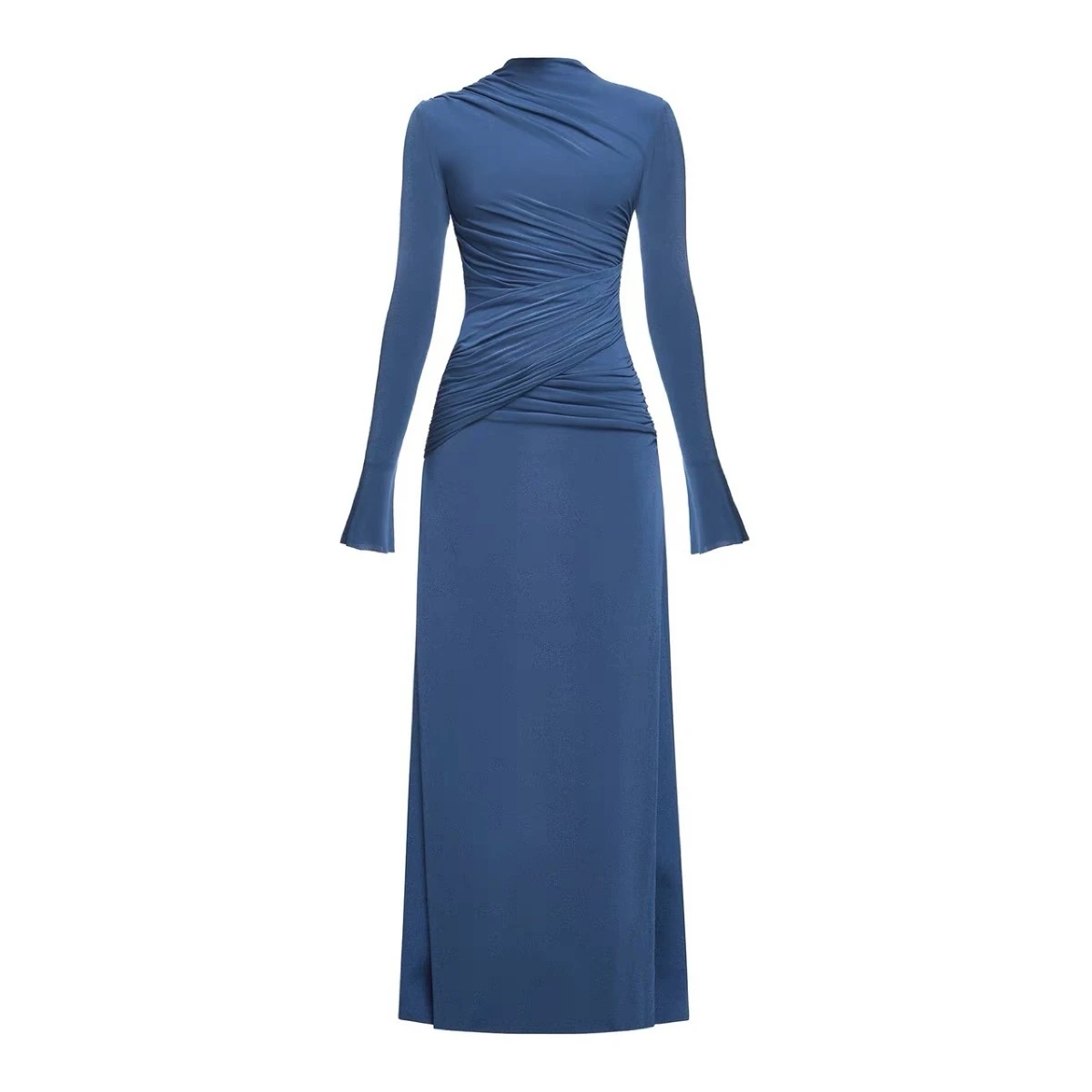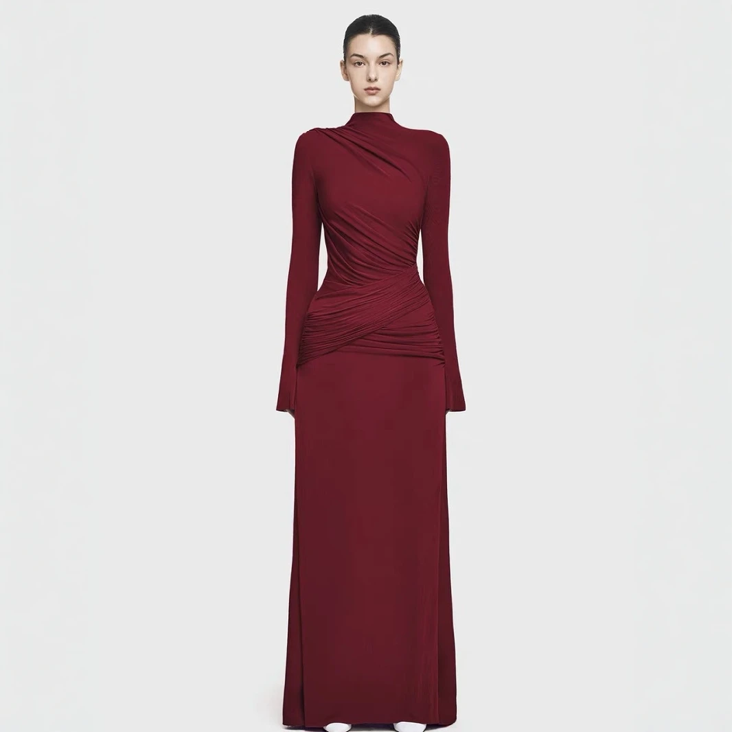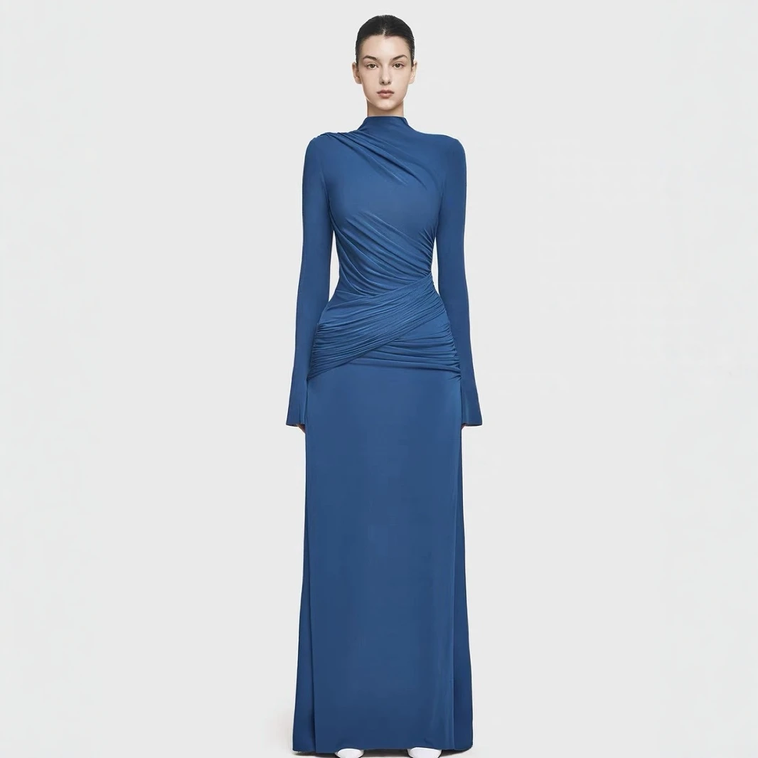 Product Name: Vietnam High Quality Design Elegant Fashion Dress Long Sleeve Stand Collar Solid Color Dress Casual Female Pleated Long Dress