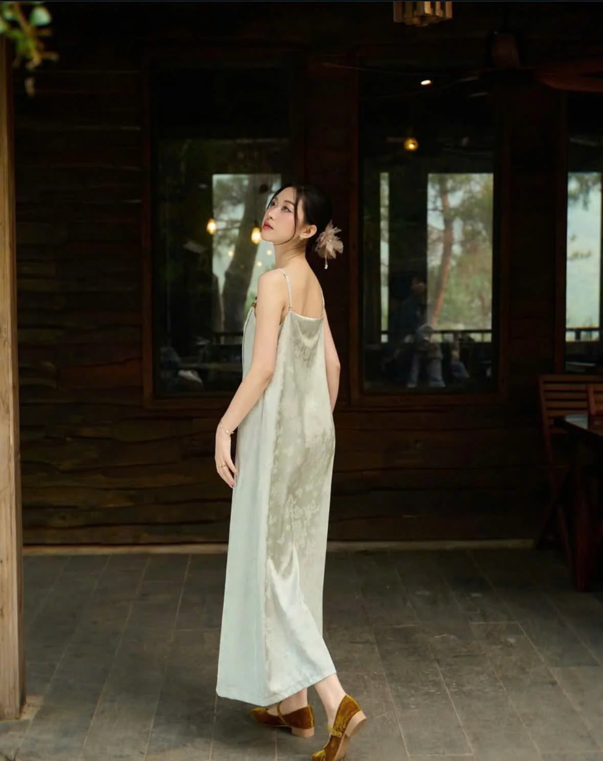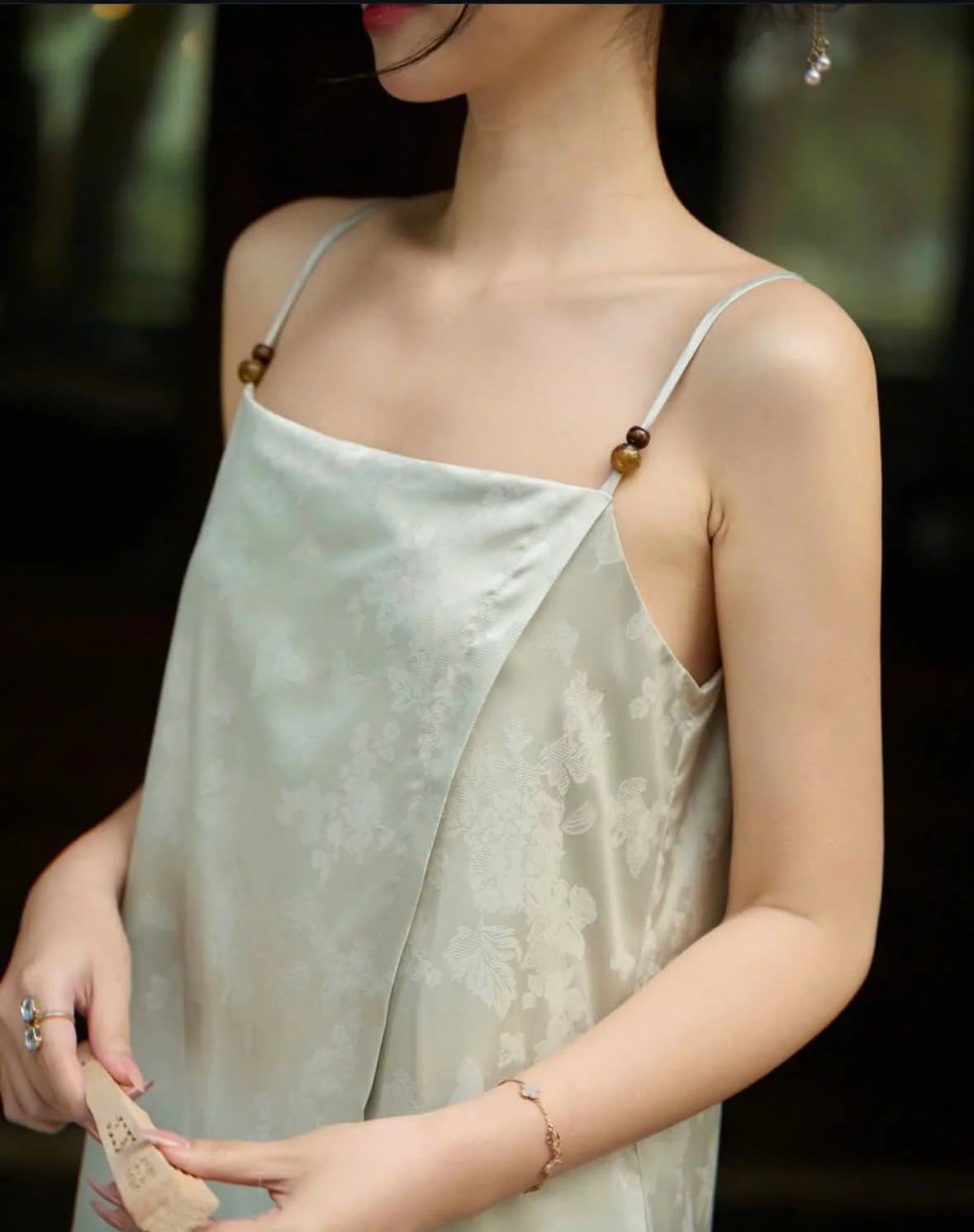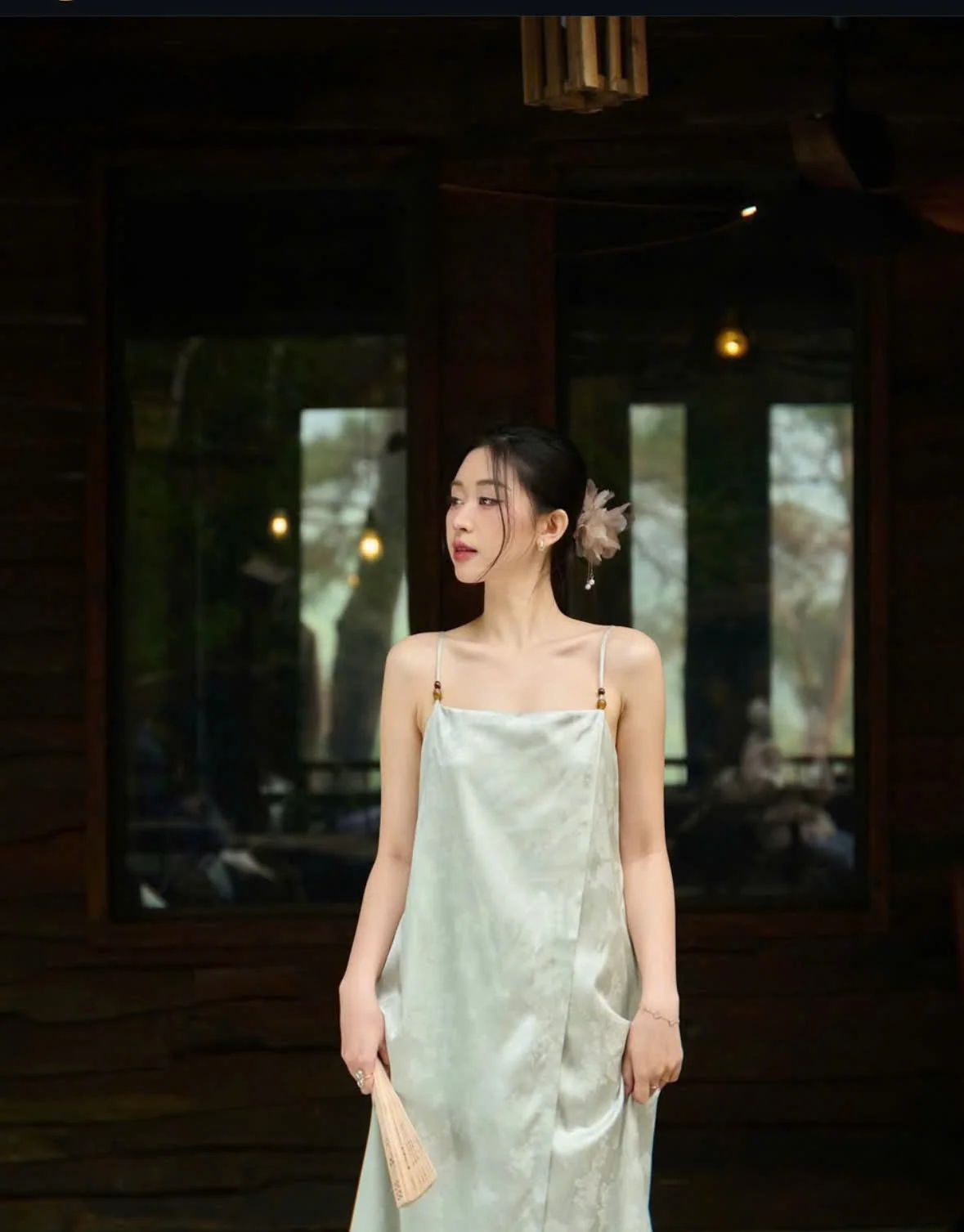 Product Name: Vietnamese fashion brand Style for women’s 2-strap dress Light green Unique design Silk material