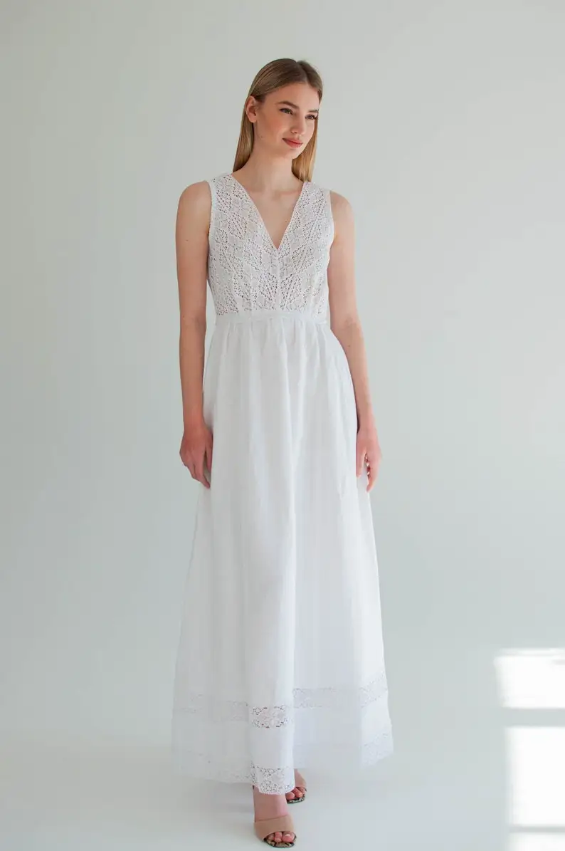 Product Name: White Linen Slip Dress with Lace 100% Cotton Size XS-Breathable Natural Waistline ODM Boho Sundress Women’s Wedding Engagement