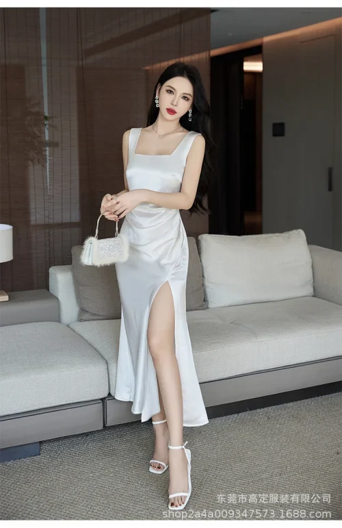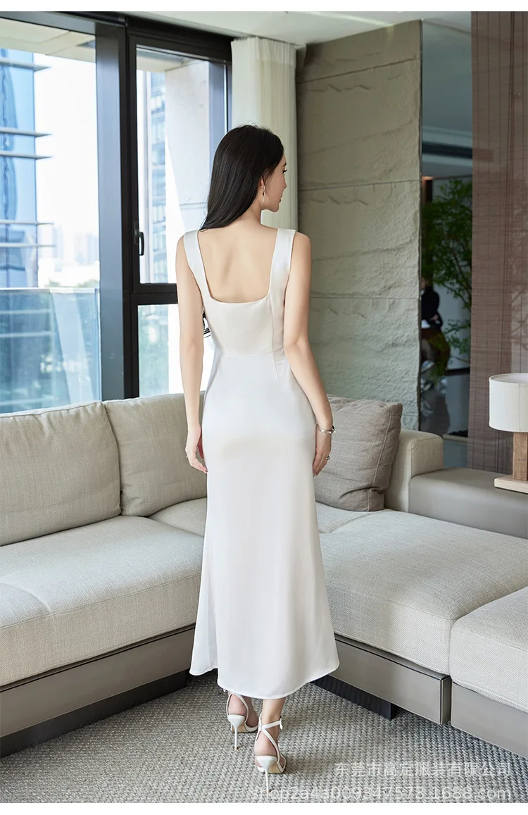 Product Name: White U-Neck Sleeveless Summer Slip Satin Dress Casual Career Dress