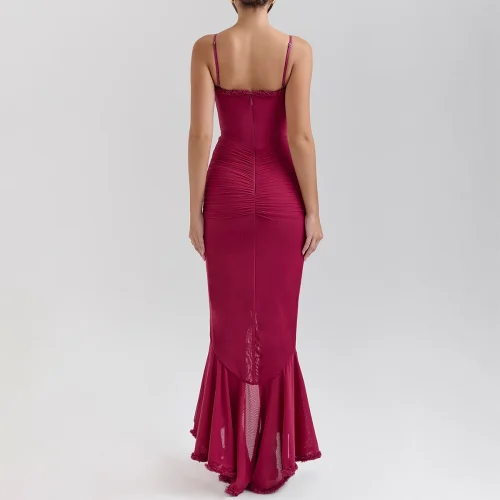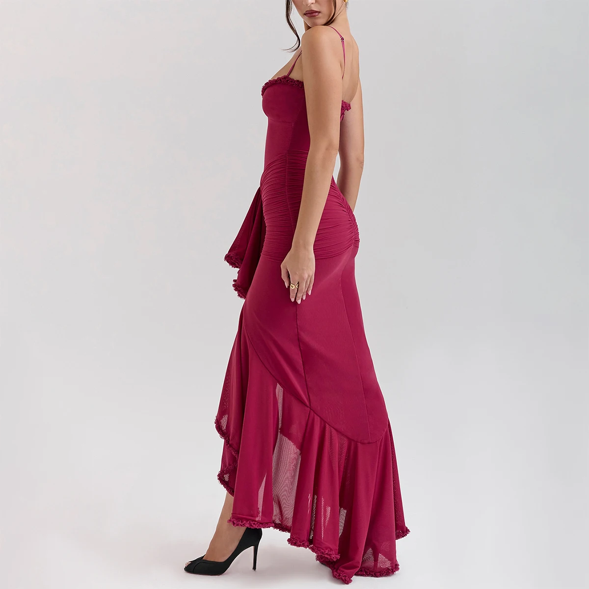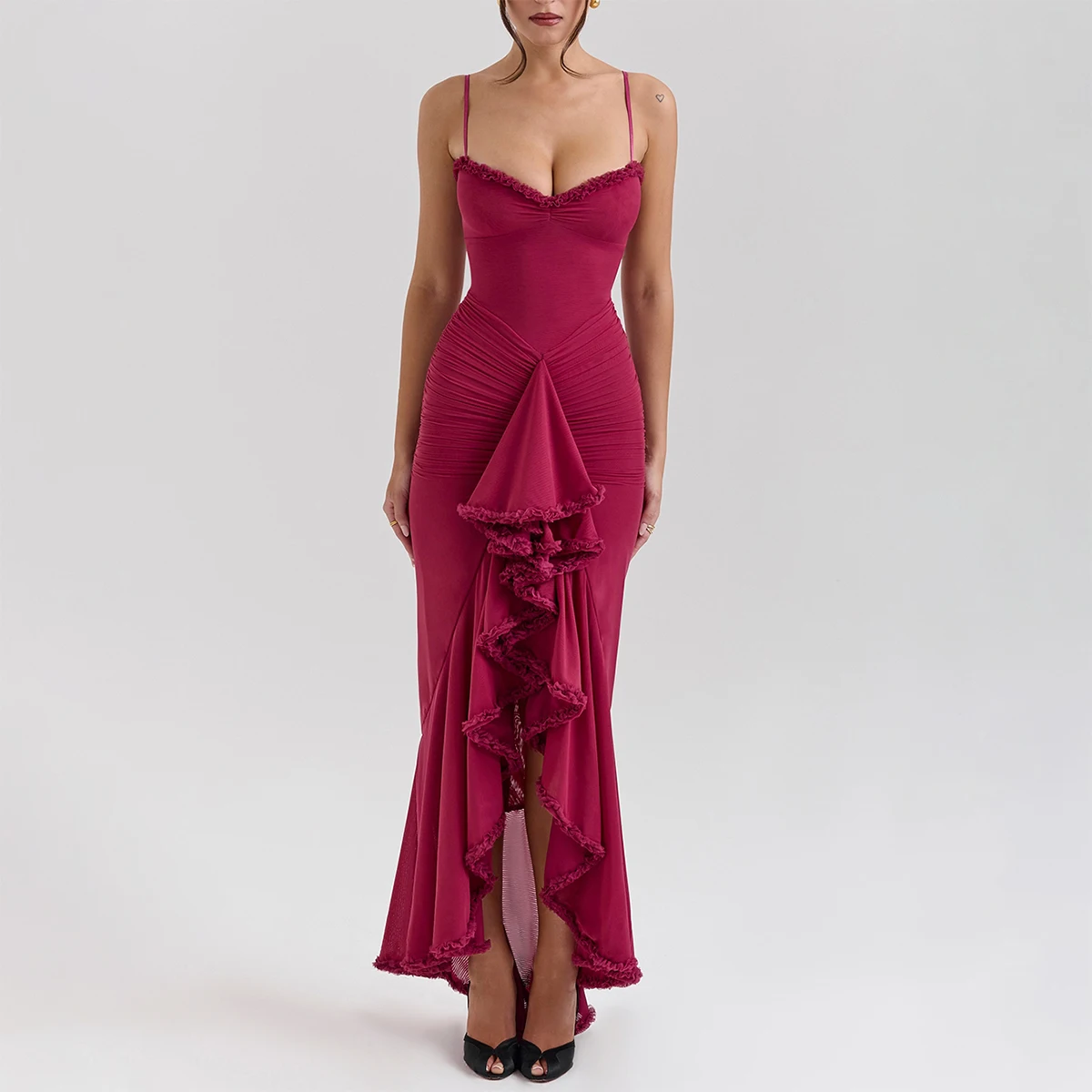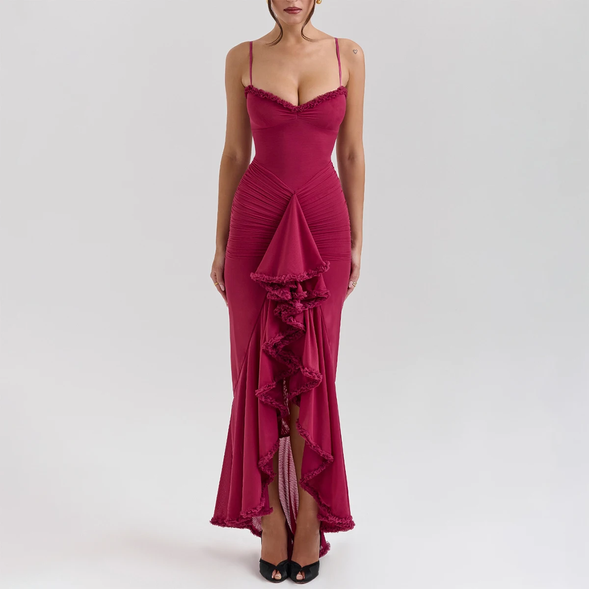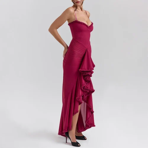 Wine Ruffled Front Gown For Women Elegant Formal Evening Gown Party Dress Fashion