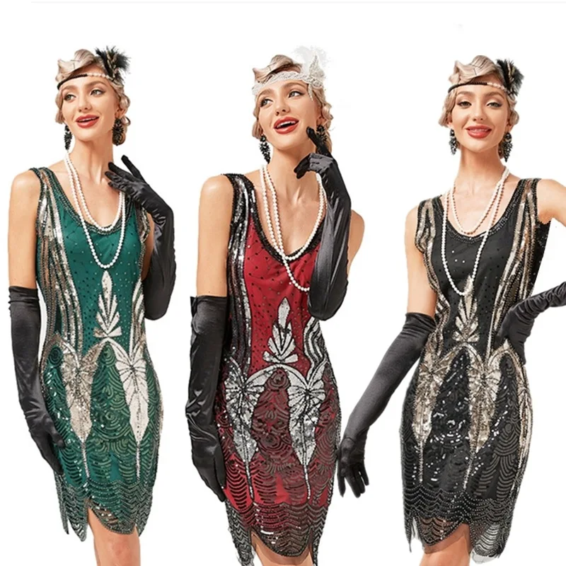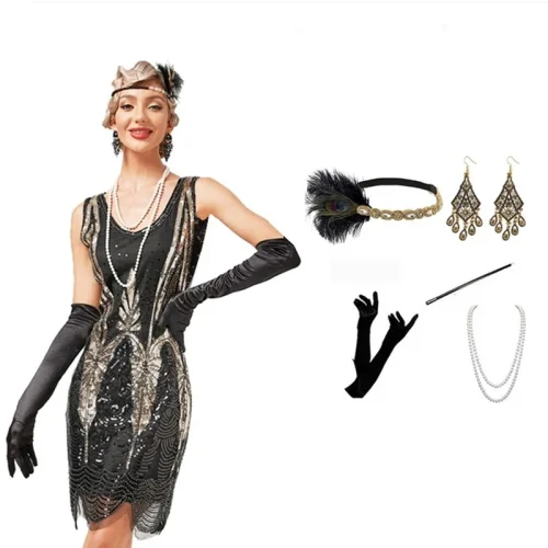 Product Name: Women Sexy Sequin Tassel Casual Dress 1920s Great Gatsby Costume Accessories Set Evething Club Mini Party Dress