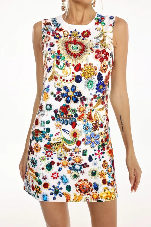 Women Sleeveless 3D Rhinestone Jewelry Summer Casual White Bodycon Flower Mini Dress