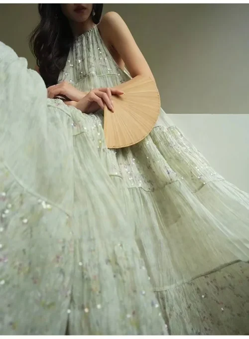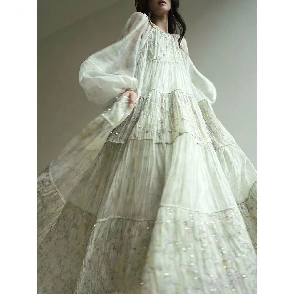 Product Name: Women Spring Summer Midi Casual Dress Ethereal Mint Green Tiered Sequined Embellishments With Long Sleeve Cape Coat