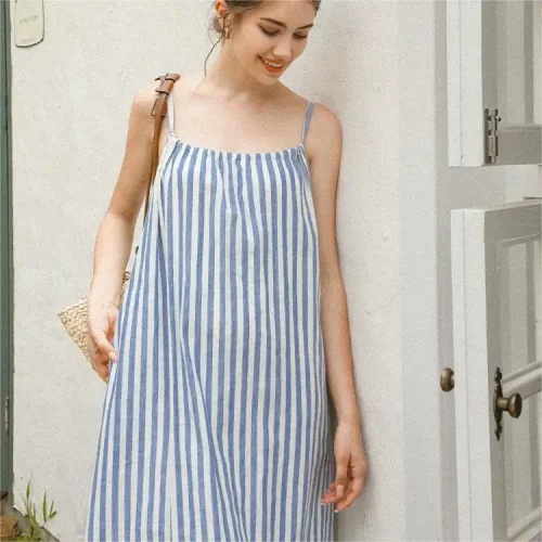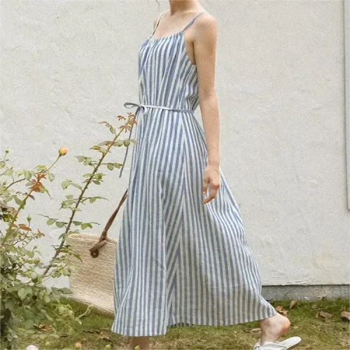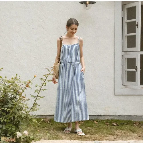 Women Striped Spaghetti Slip Sleeveless Dresses Ladies Casual Maxi Long Light Blue Halter Collar Cotton Linen Dress With Pockets