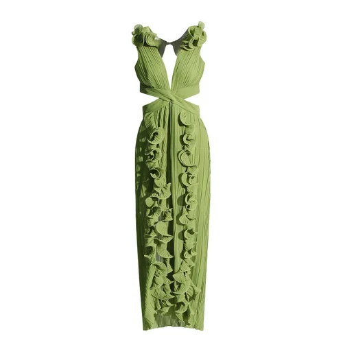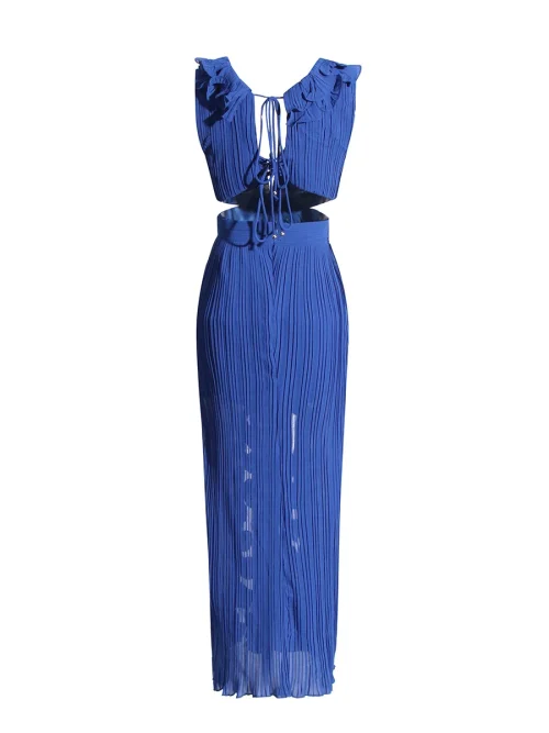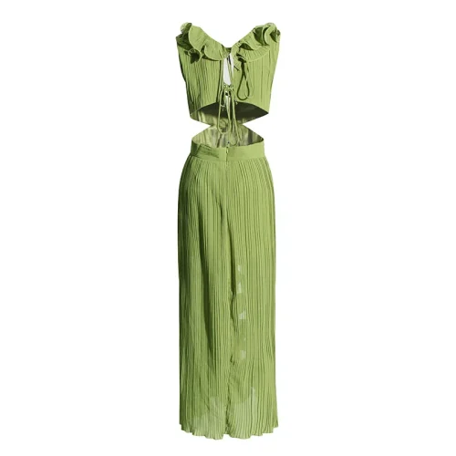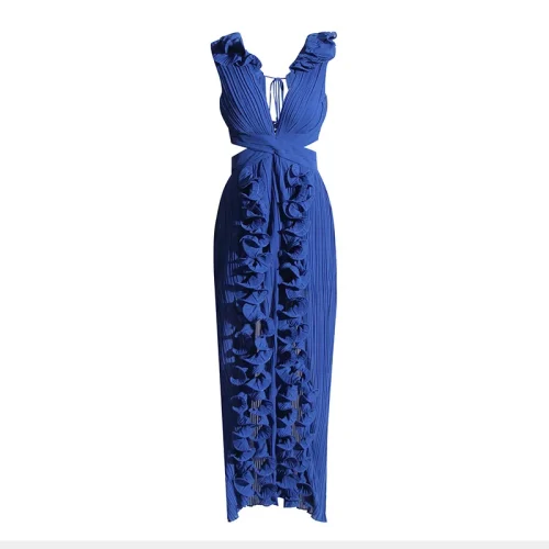 Product Name: Women Summer Casual Solid Long Dresses Design Fashion V Neck Sleeveless High Waist Patchwork Ruffles Split Pleated