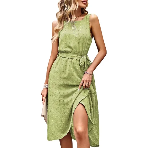 Women Summer Dresses Belted Sleeveless Split Midi Dress Casual Crew Neck Boho Sundress With Pockets