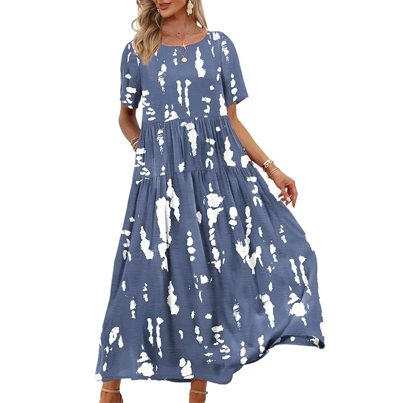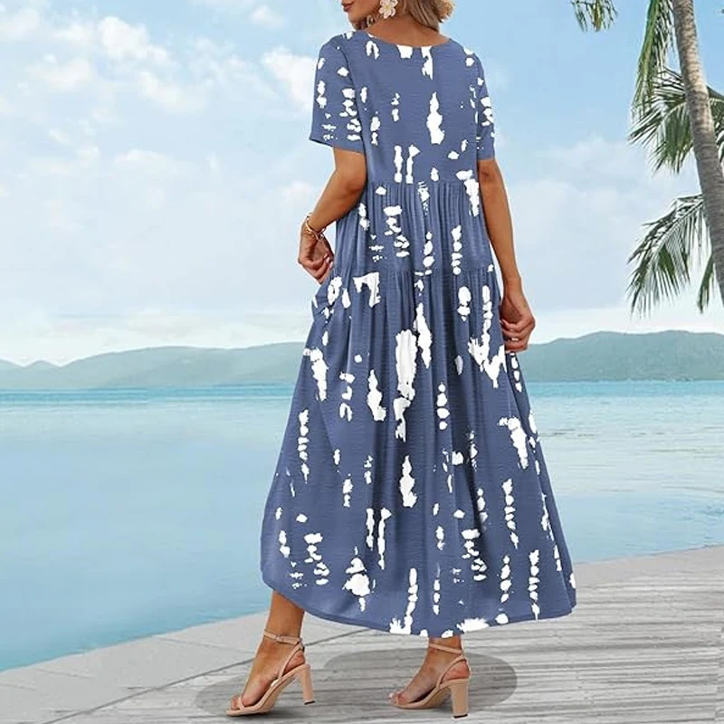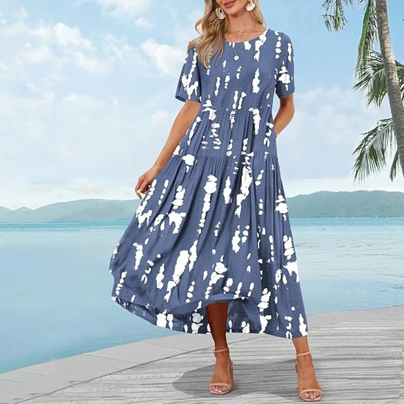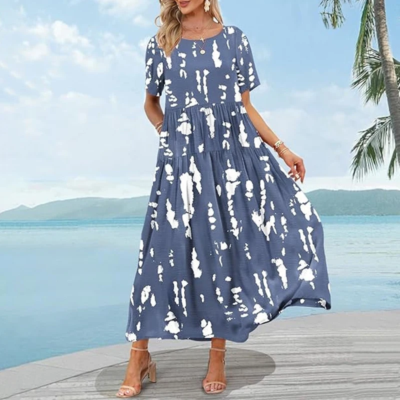 Women’s Casual Loose Summer Dress Women Casual Dress Long Boho Round Neck Beach Maxi Dress