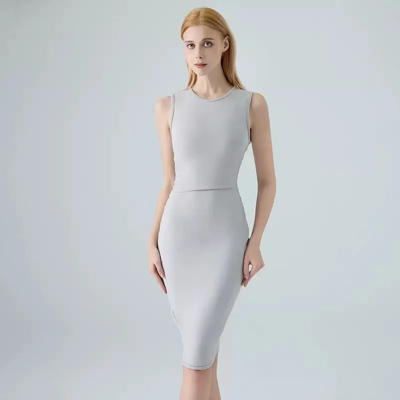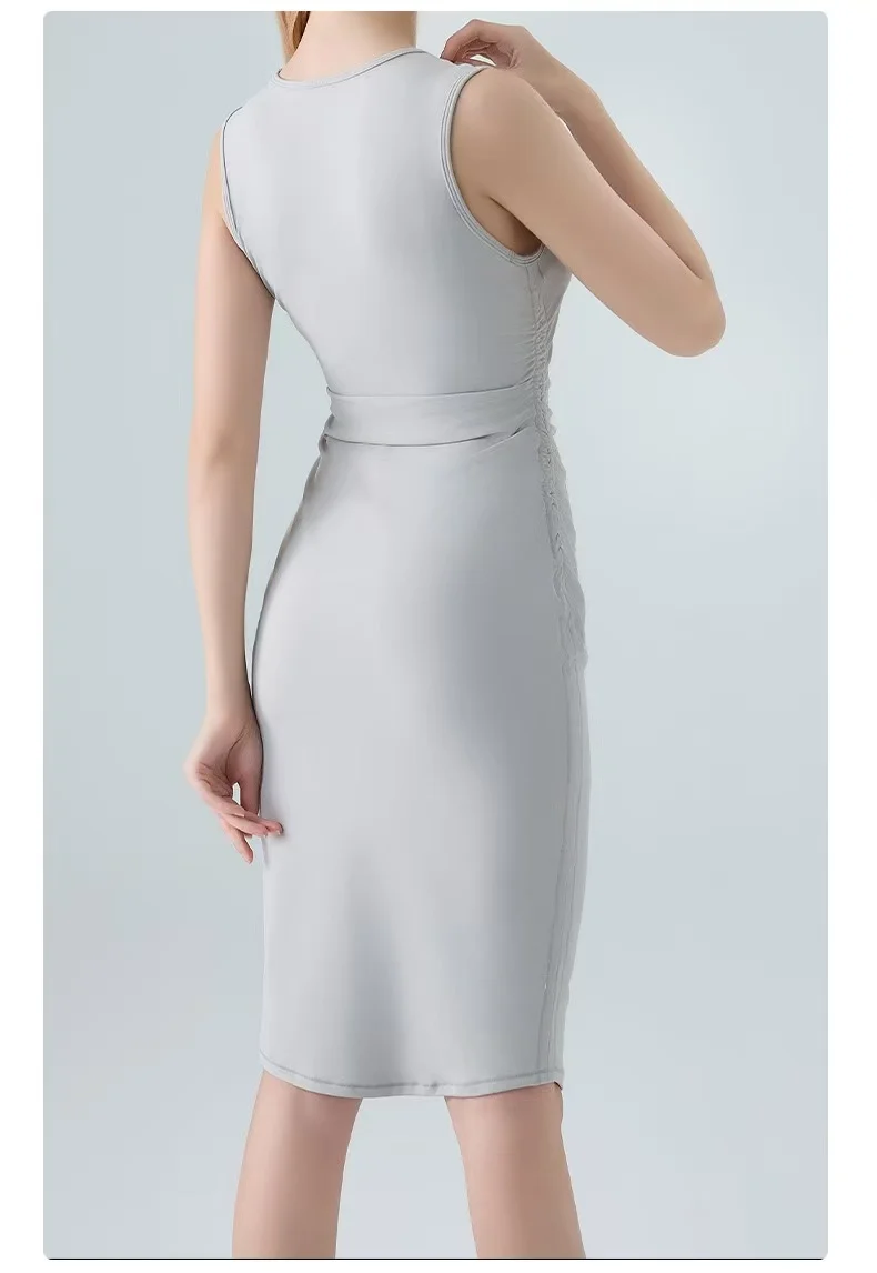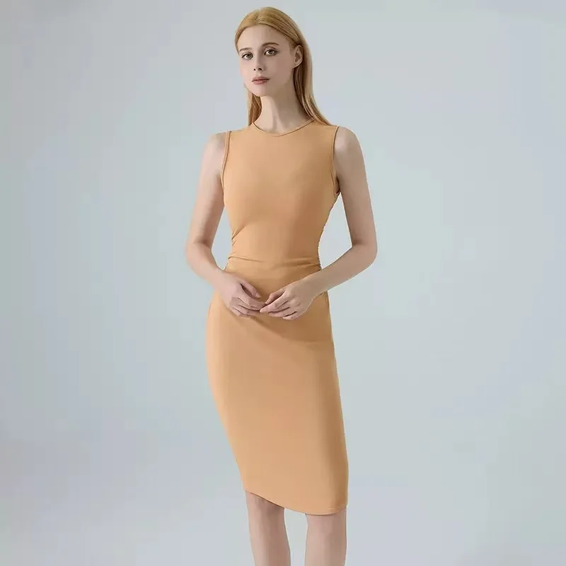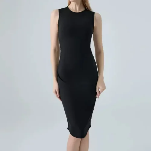 Women’s Casual Spring Bodycon Dress – Solid Color Silk Sleeveless Midi with Crew Neck
