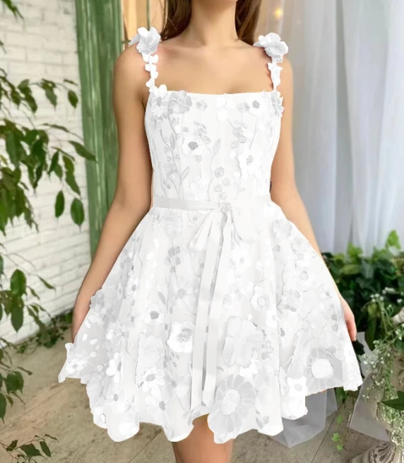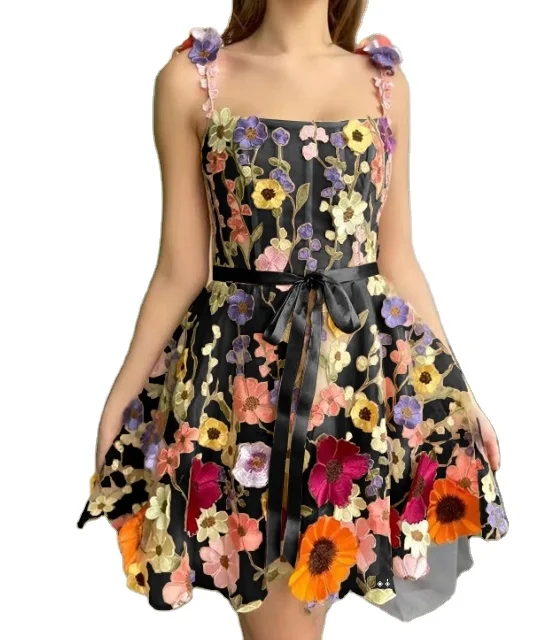Product Name: Womens Dresses 2024 Summer Fashion 3D Floral Embroidery Casual Square Neck Sleeveless Lace-Up Daily Mini Camisole Dress
