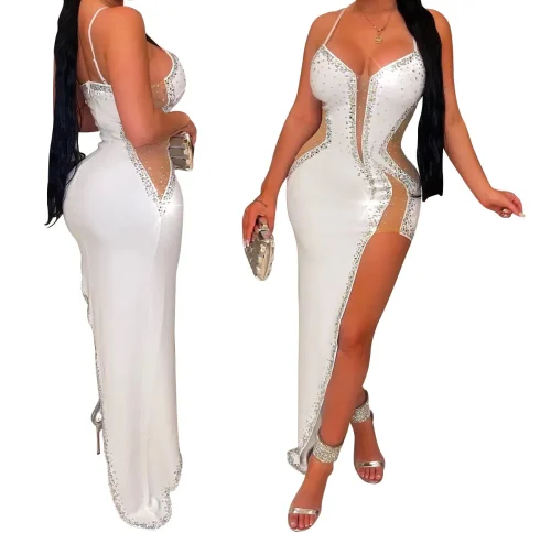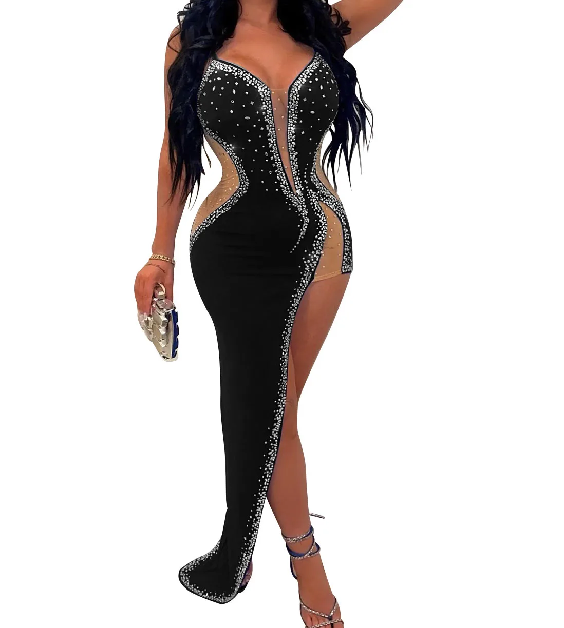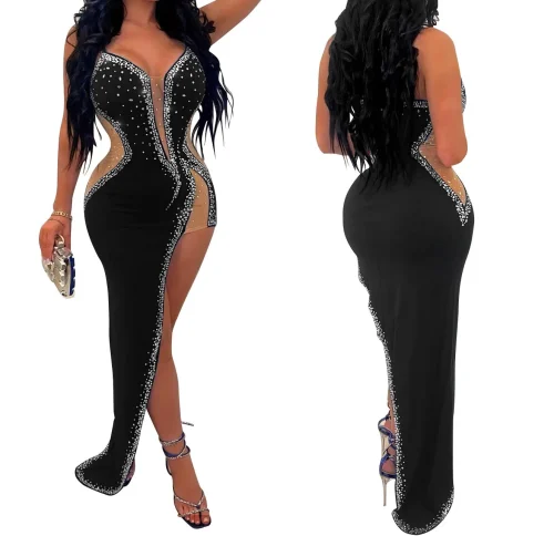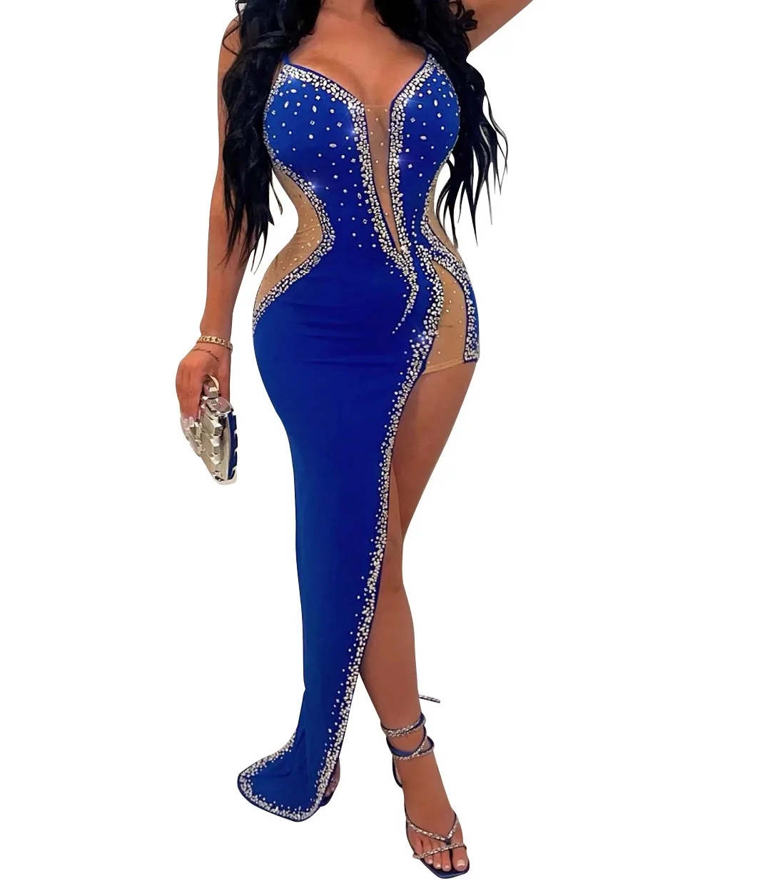 Women’s Elegant Silk Dressing Gowns with Shiny Crystal Rhinestones Pearls Street Style Sexy Slit Evening Dress Prom Bride Style