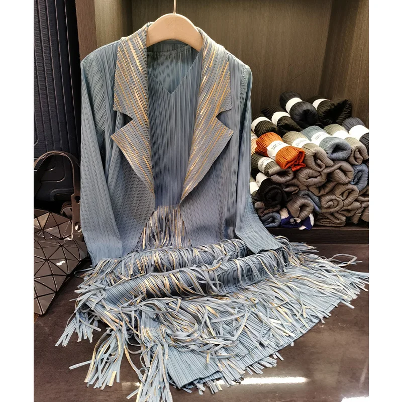 Product Name: Women’s High-End Fashion Two-Piece Set V-Neck Tassel Sleeveless Dress Pleated Cardigan Casual Loose Fit Solid Inspired Miyake