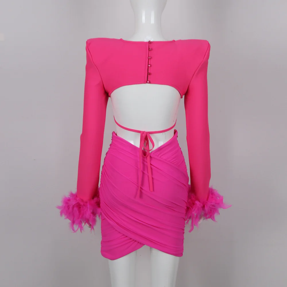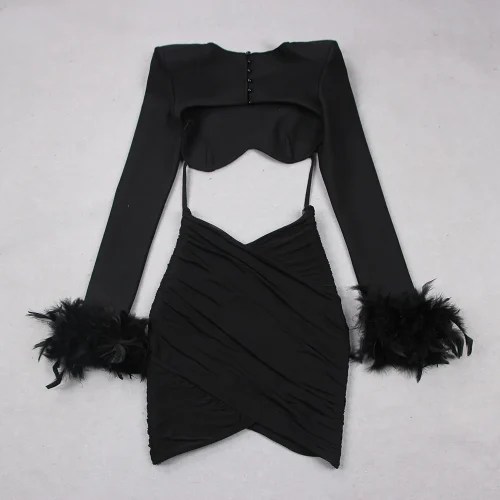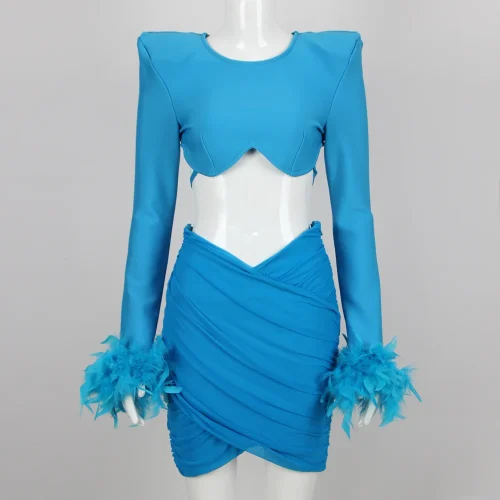Product Name: Women’s New Long-Sleeved Commuting Dress with Feather Temptation Skinny Fit Two Piece French Skirt Set Solid Pattern