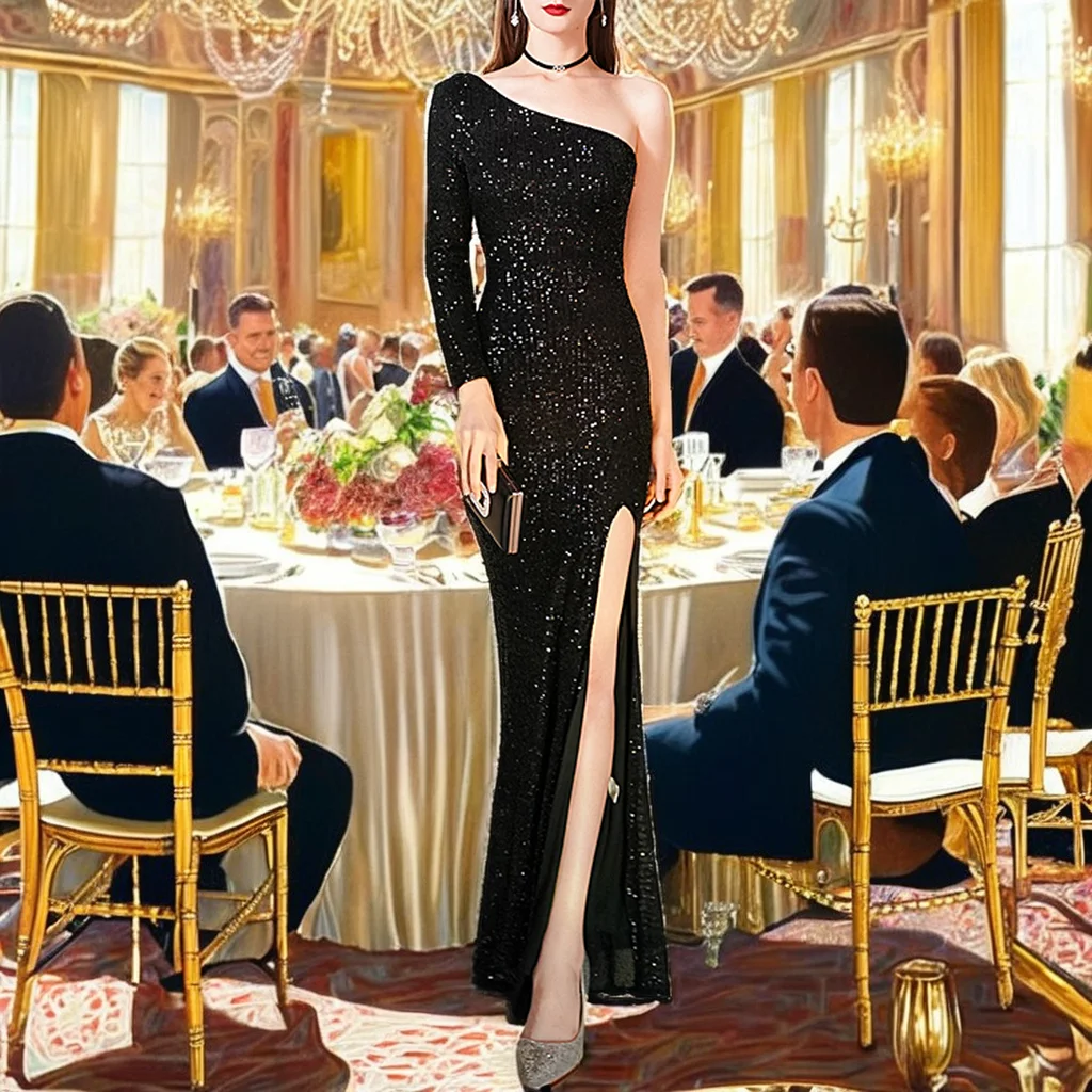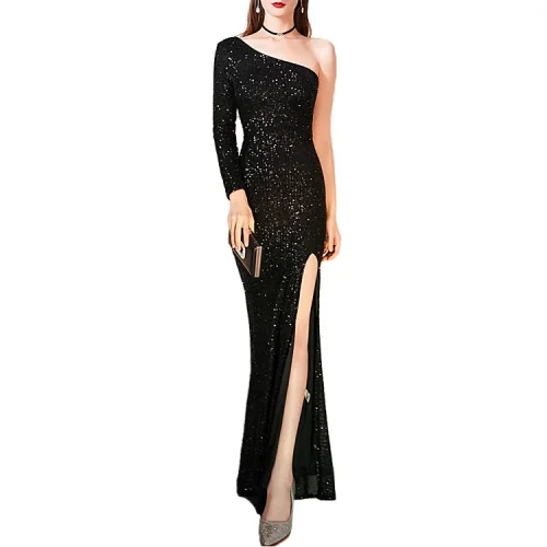 Product Name: Women’s One-Shoulder Evening Dress Sequined Decoration Floor-Length Sweep Train for Company Annual Meeting Dinner Party Host