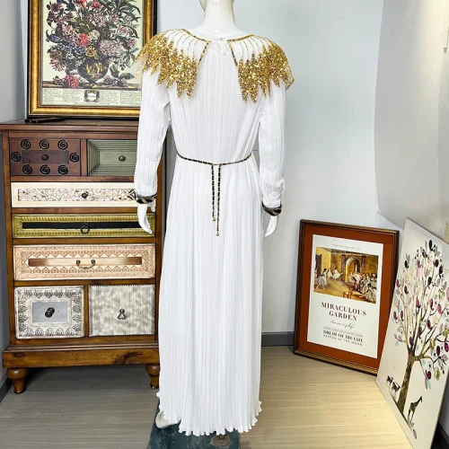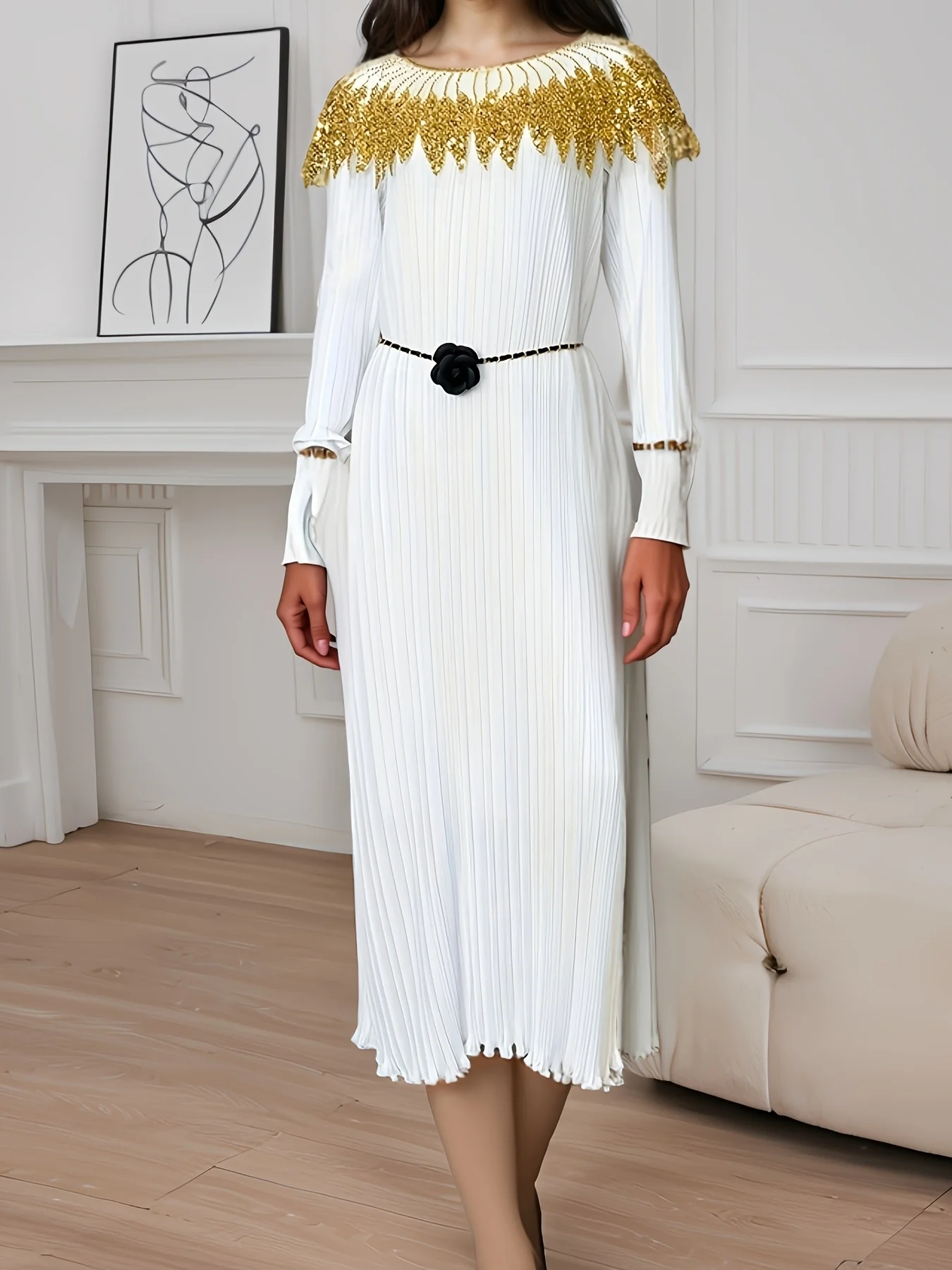 Women’s Pleated Elegant Dress Formal Office Lady Print Solid Pattern Puff Sleeves Belt Buttons XL for Party Vacation Day