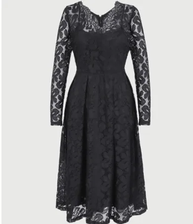 Product Name: Women’s Pure Color Lace V Neck a Line Pleated Dress Black Wine Long Sleeve Women Elegant Party Banquet Dress