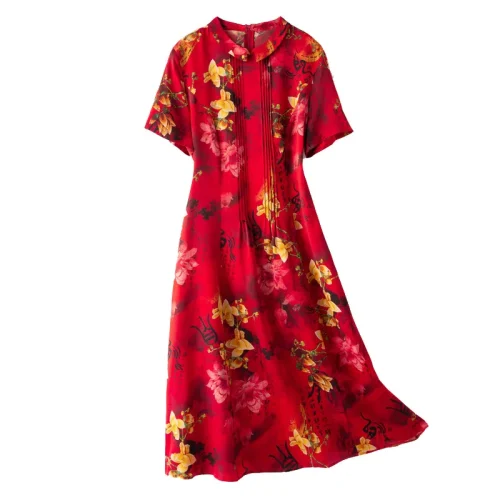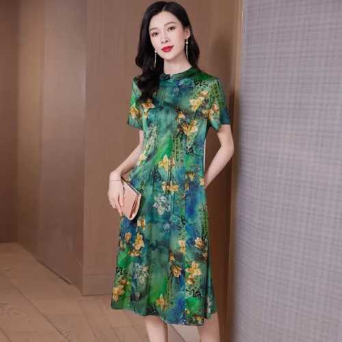 Product Name: Women’s Retro Floral Printed Satin Dress New Summer Collection with Natural Waistline Woven in Casual Style Silk Dress