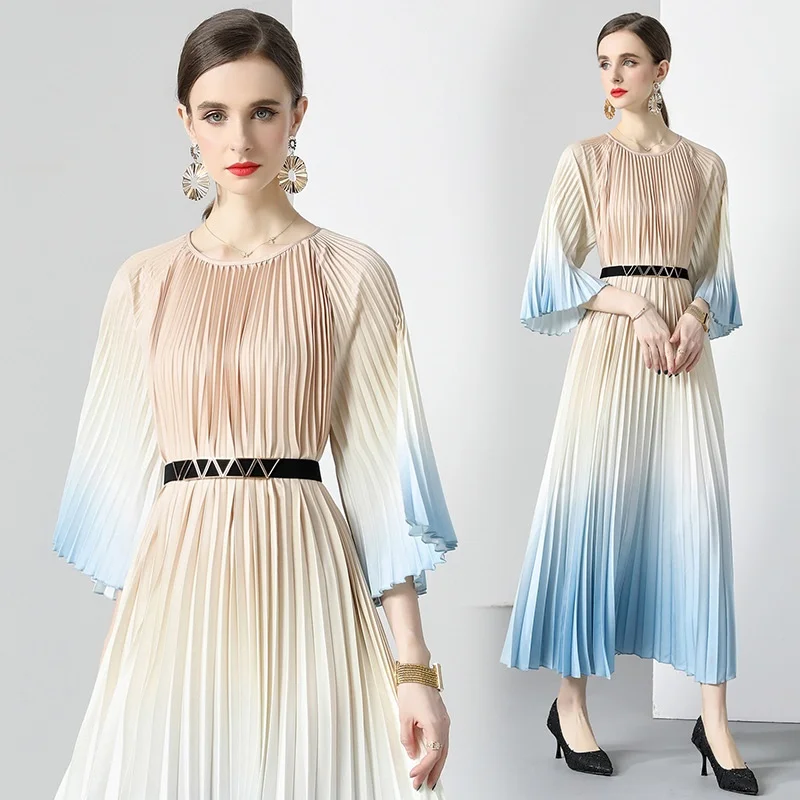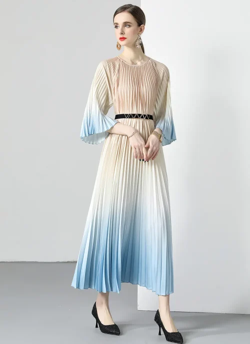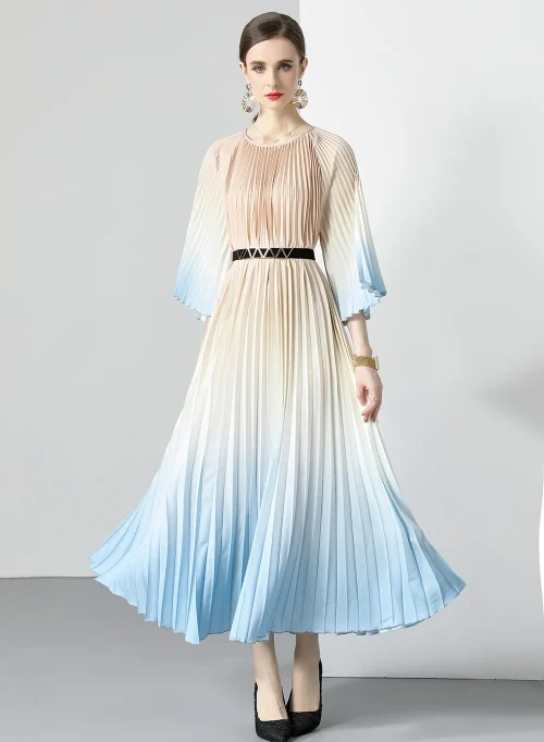Product Name: Women’s Retro Gradient Color Pleated Big Swing Long Dress New Fashion Floral Print Washable Casual for Day Occasions Summer