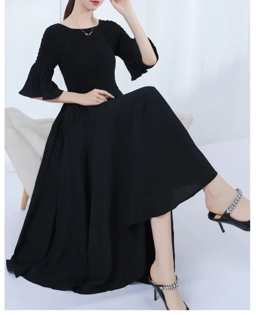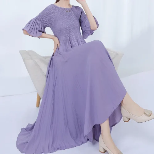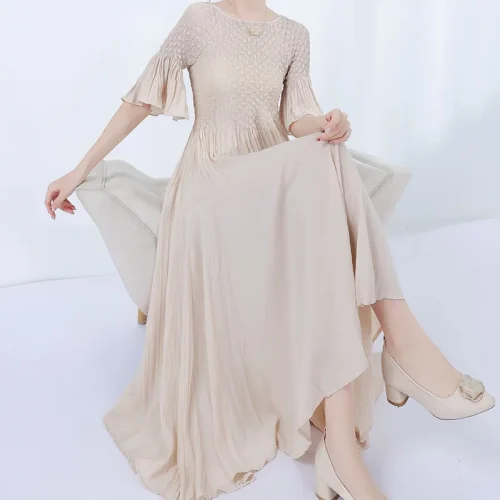 Product Name: Women’s Short Sleeve High Waisted Pleated Dress Summer Breathable Solid Color Miyake Dress Woven Weaving Method