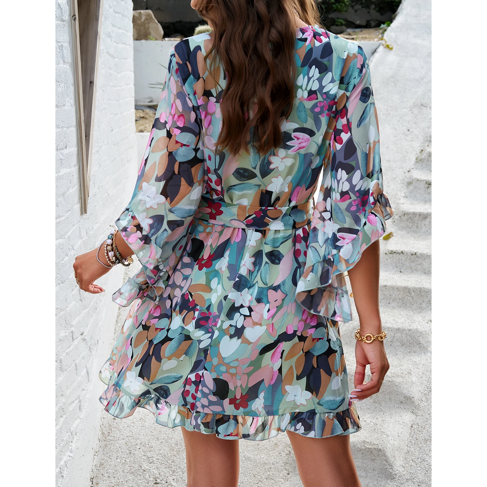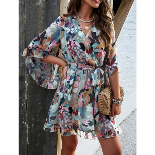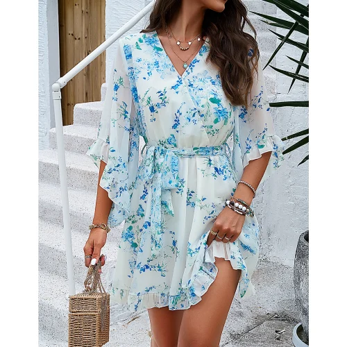 Womens Summer Chiffon Floral Beach Dress Sundress a Linie 3/4 Short Sleeves Semi-formal Knee Length Dresses Casual 2025 Outfit