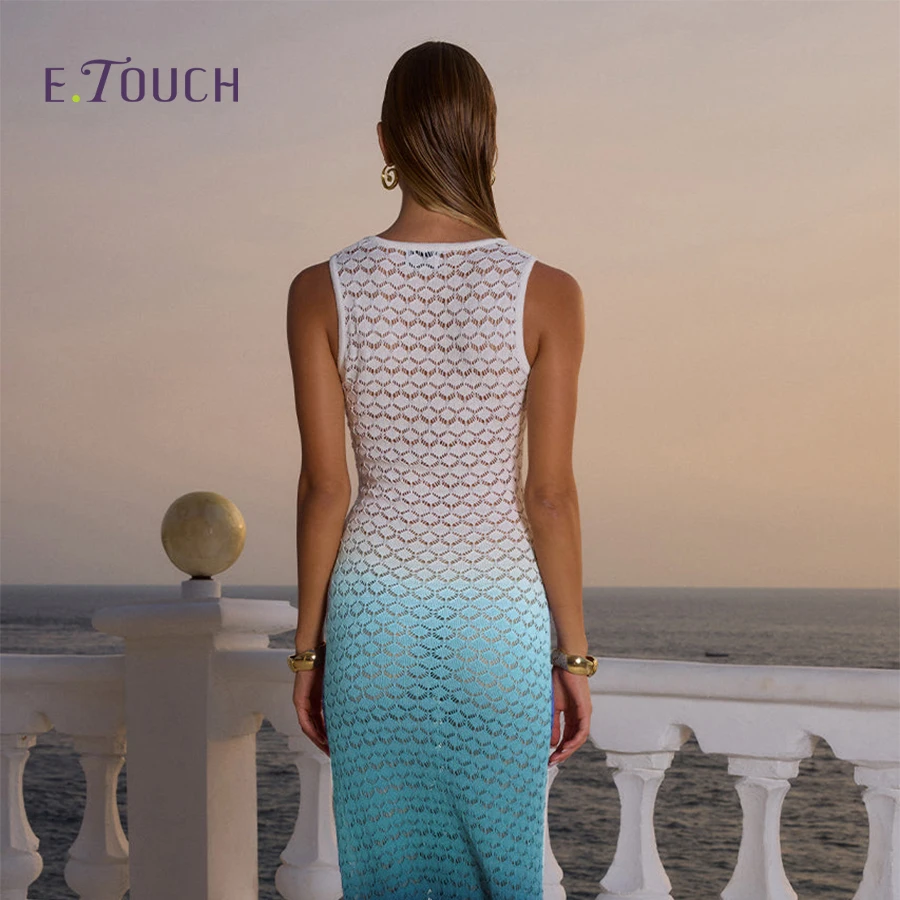 Women’s Summer Knit Lace-Up Dress – Trendy Gradient Blue Casual Dress