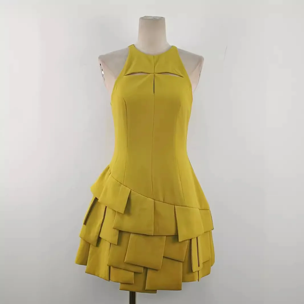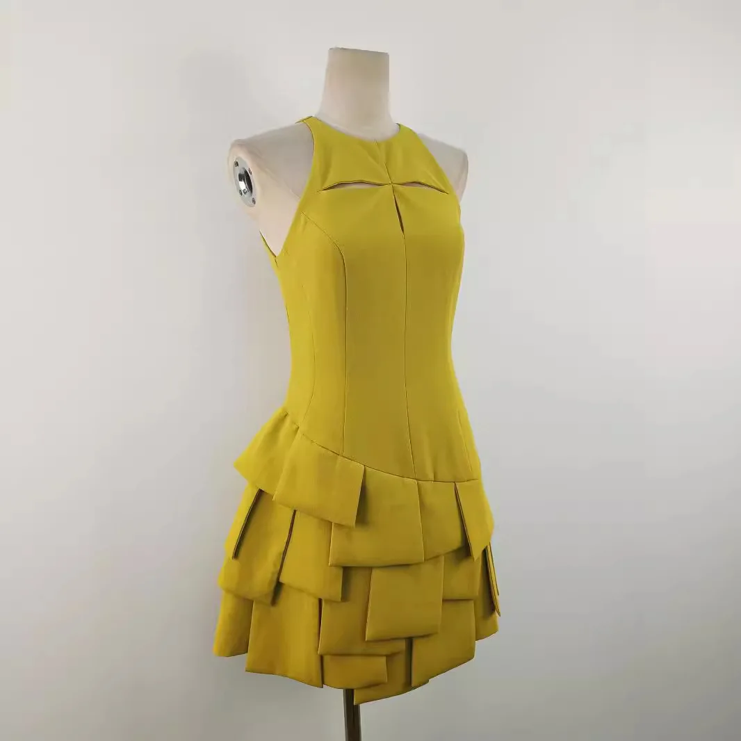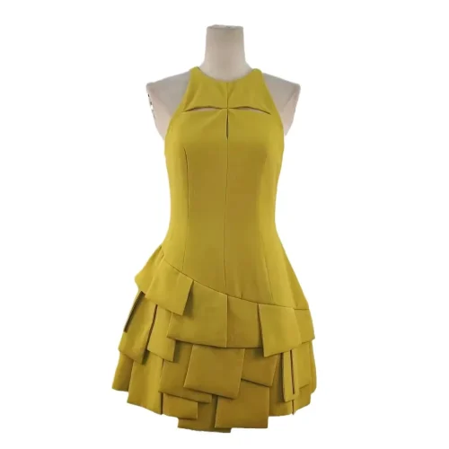 Product Name: Women’s Yellow Patchwork Sleeveless Summer Dress Slimming Waist Party-Style with Ruffle Decoration and Anti-Static Feature